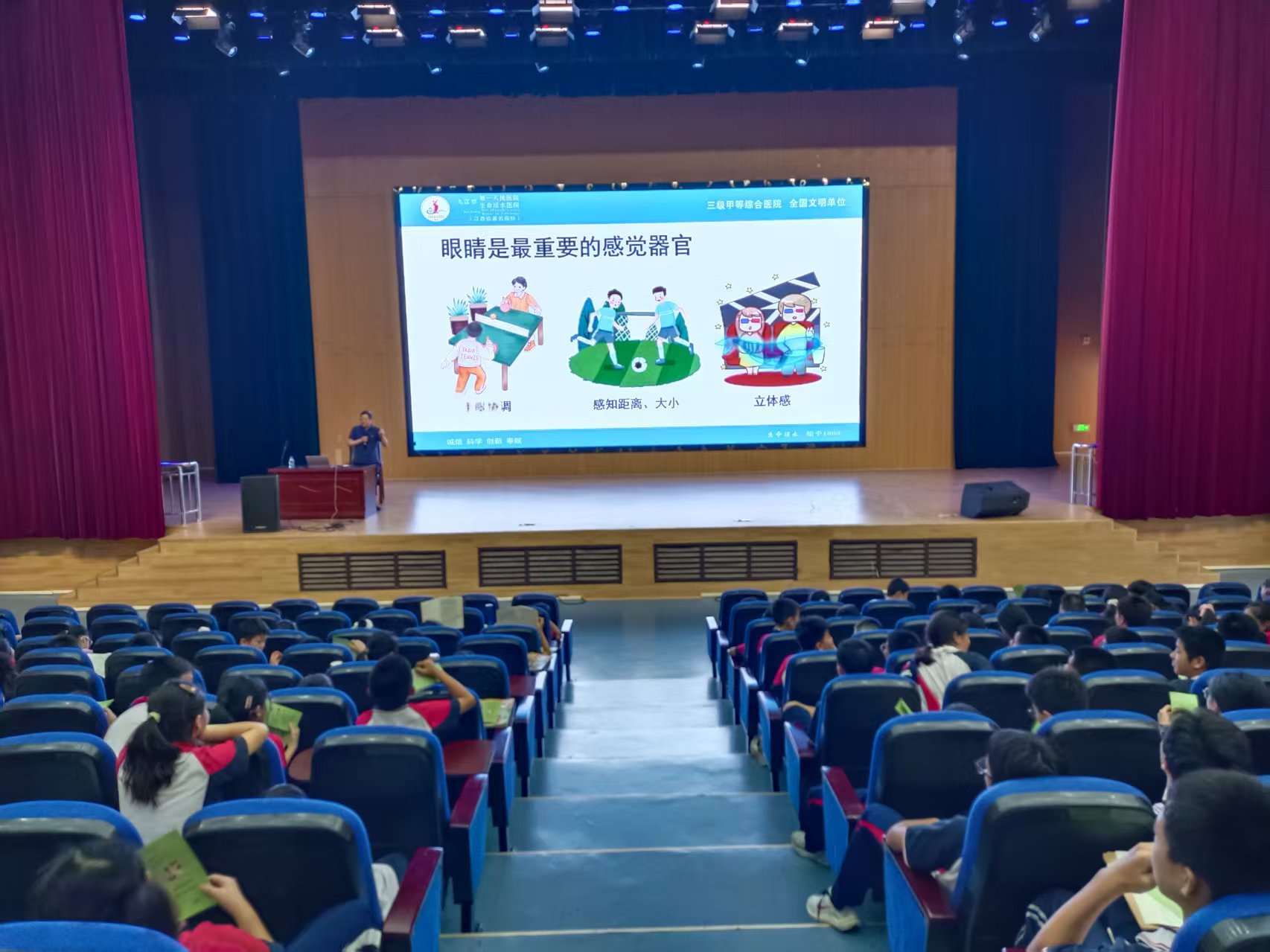 邀请九江市第一人民医院眼科专家进校园讲座。专家用解剖模型、动态视频讲解近视原理,对小学段强调 “减屏幕、多户外”,对初中段解析真假近视区别、指导配镜,现场答疑,提供个性化建议。