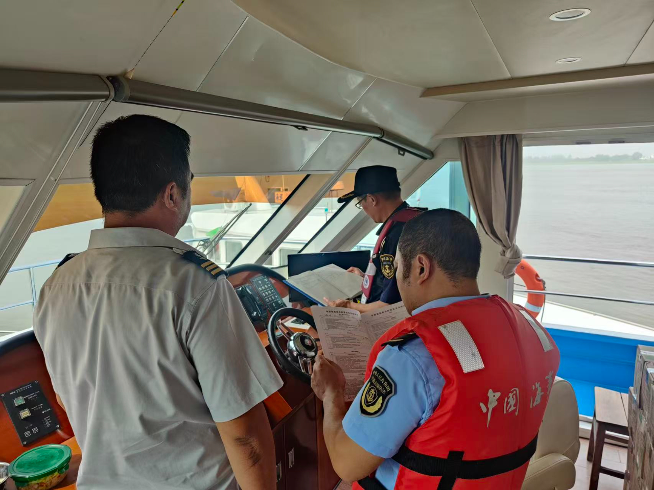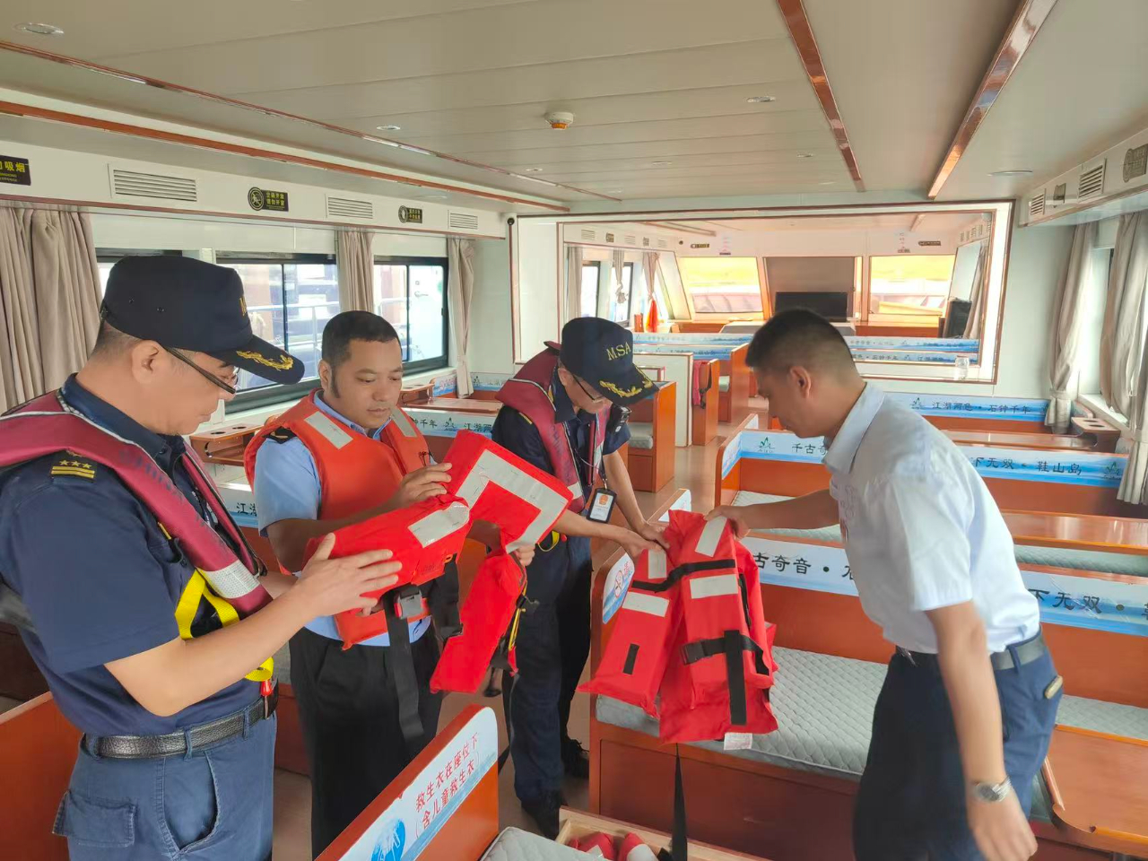执法人员联合湖口地方海事局在江湖两色旅游客运码头登上“银砂湾号”,对船舶证书、配员、消防救生设备、防污染措施进行“清单式”核查,现场测试主推进器、舵机应急转换,抽查旅客救生衣及儿童救生衣情况,并对旅客开展节假日水上安全出行“微课堂”,现场演示救生衣规范穿着等,引导游客懂自救、会互救。