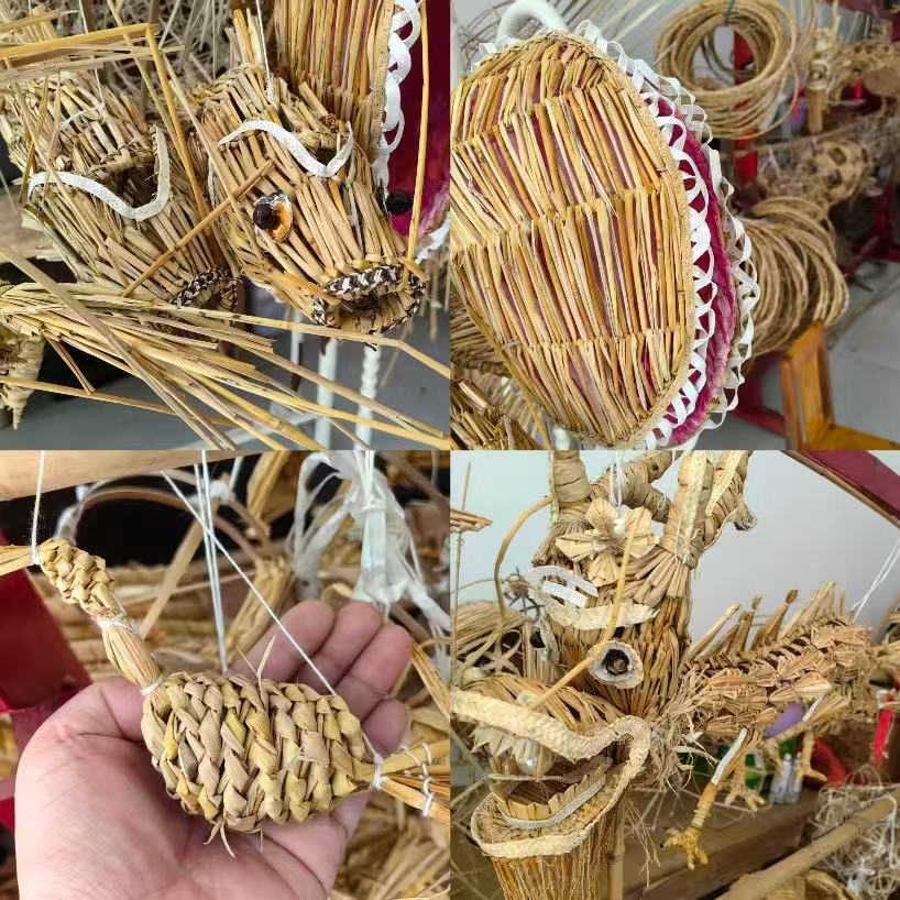 老师们走进传习所,仿佛置身草编艺术的奇妙世界:各类草龙作品错落摆放,既有威风凛凛、形态完整的大型草龙,也有精巧别致、便于把玩的迷你龙饰,无论是龙鳞的细腻纹路,还是龙骨的立体架构,都清晰展现着传统技艺的精湛与深厚积淀。在与喻远莉老师的交谈过程中,令人记忆犹新的是,她始终立足湖口本土特色探索创新,将本地水域常见的鱼、虾、鸟、蟹等生灵形象融入草编创作,这些作品不仅造型栩栩如生,还带着几分憨态可掬的趣味,让古老的草编技艺与家乡的生活场景紧密交融,绽放出全新的时代活力。