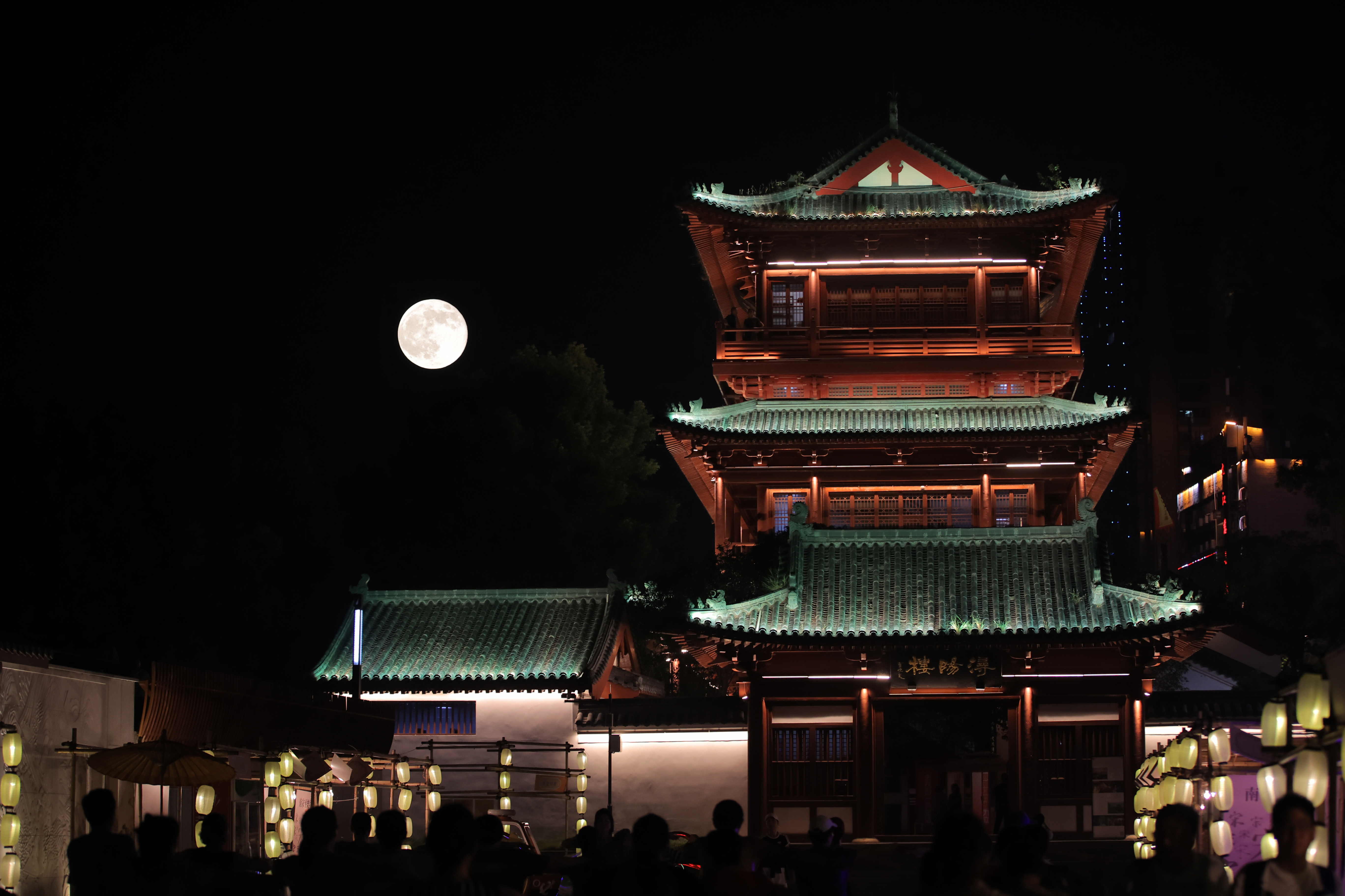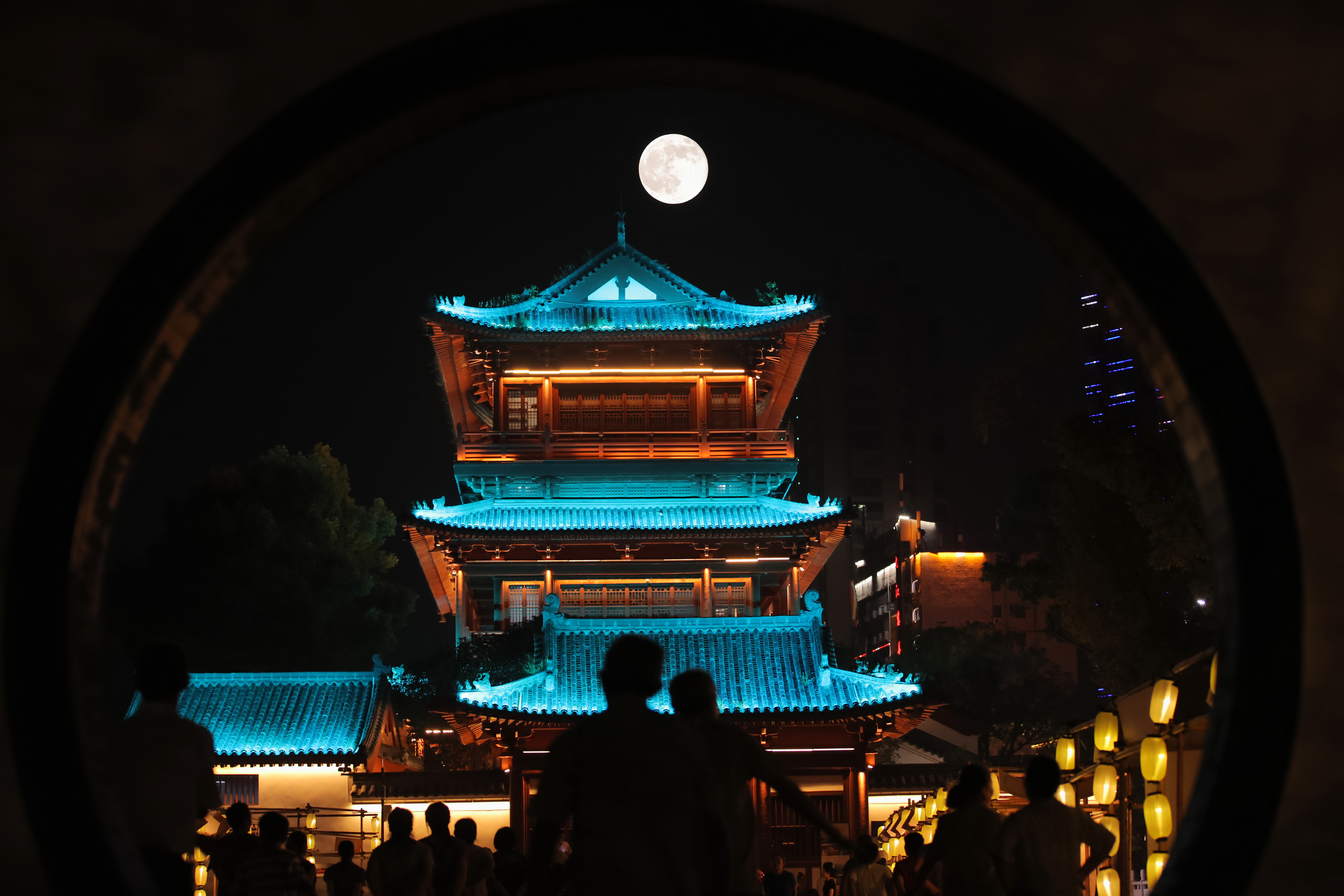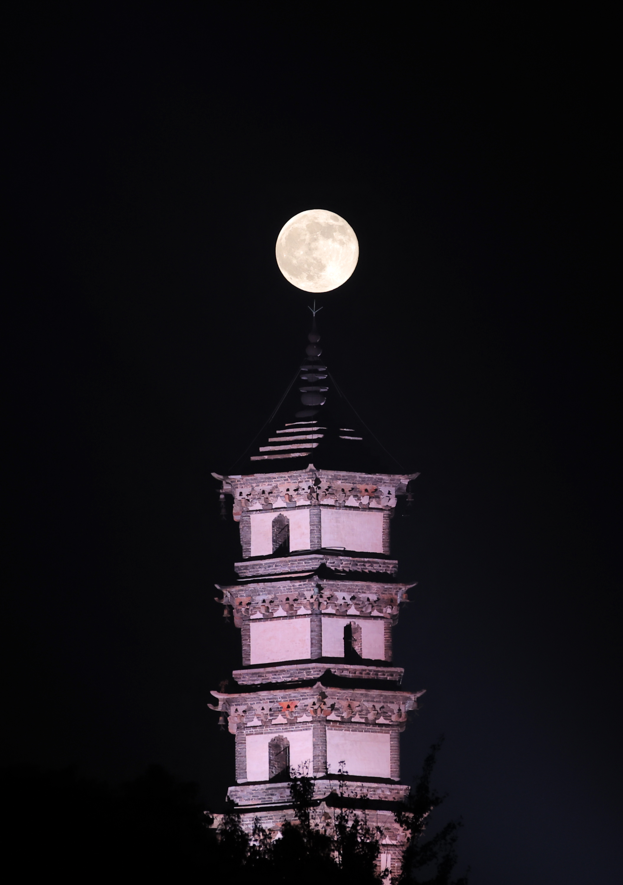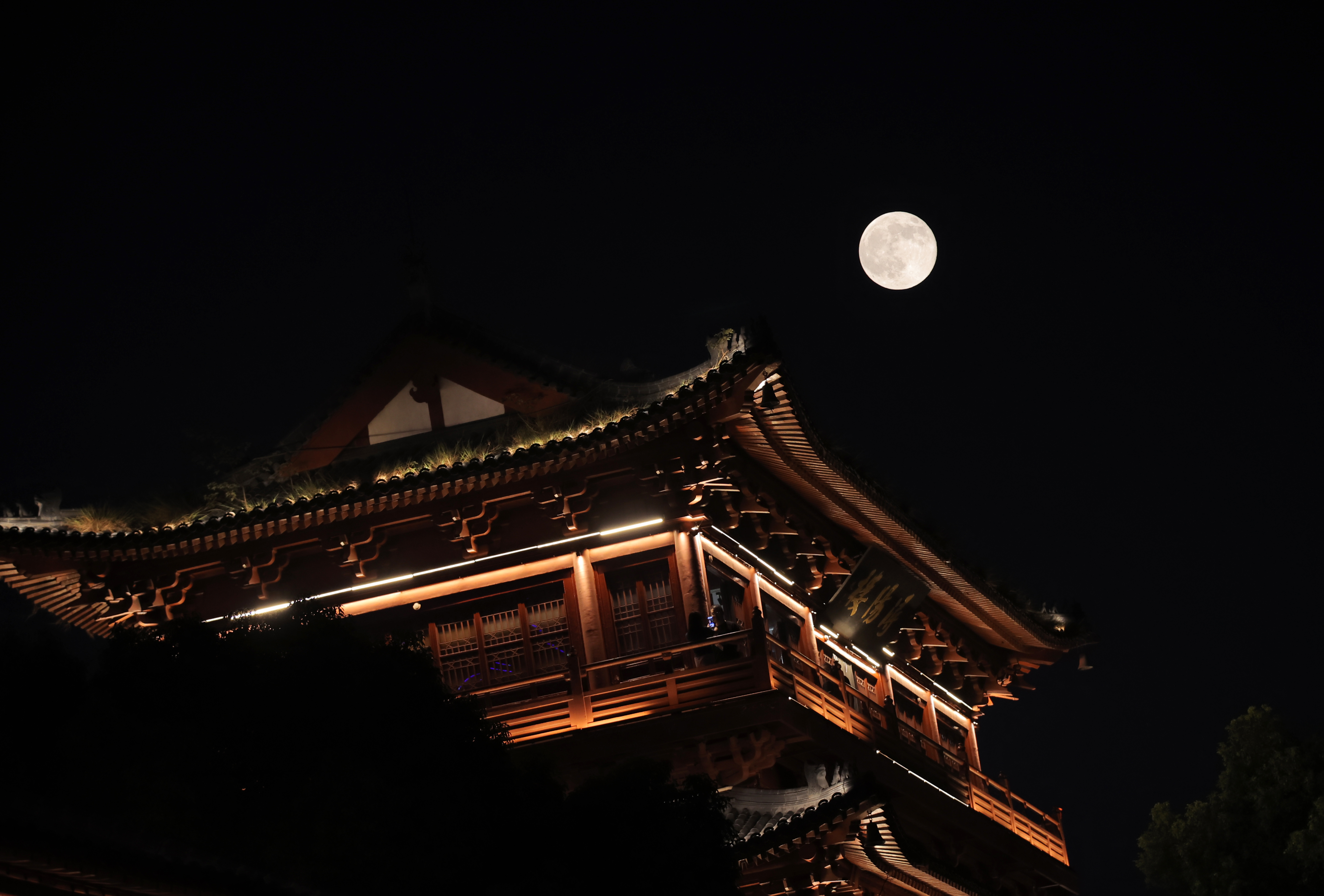 九江新闻网讯(九江日报全媒记者 刘家 文/摄)10月7日晚,农历八月十六,浔阳楼前,一轮皎洁的明月高悬夜空,与古色古香的建筑相映成趣。今年中秋再次印证了“十五的月亮十六圆”的俗语,满月最圆时刻出现在7日11时48分,尽管在白天,但月出后一小时仍是观赏的黄金时段。今年的中秋满月不仅是“十六圆”,更是一轮难得的“超级月亮”,在本年度所有满月中排名第三大。此轮“超级月亮”的视直径比普通满月增大约14%,亮度提升约30%。