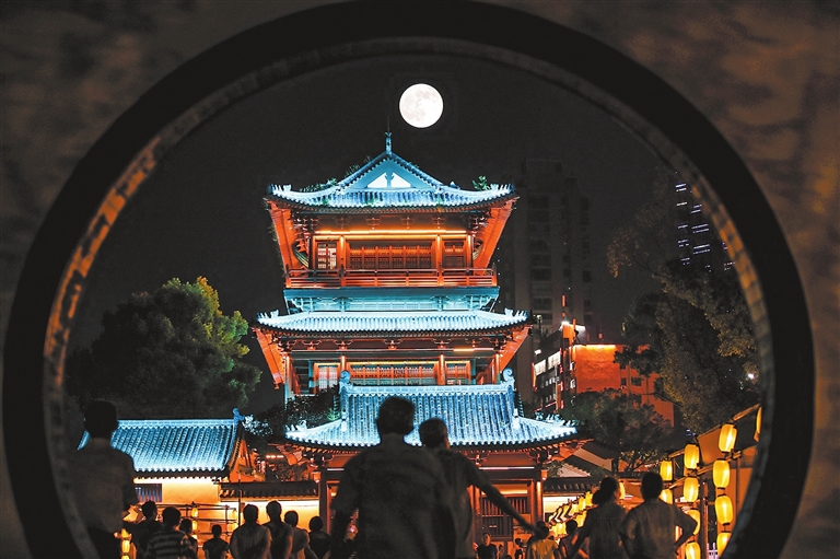 10月7日晚,浔阳楼前,一轮皎洁的明月高悬夜空,与古色古香的建筑相映成趣。(九江日报全媒记者 刘家 摄)