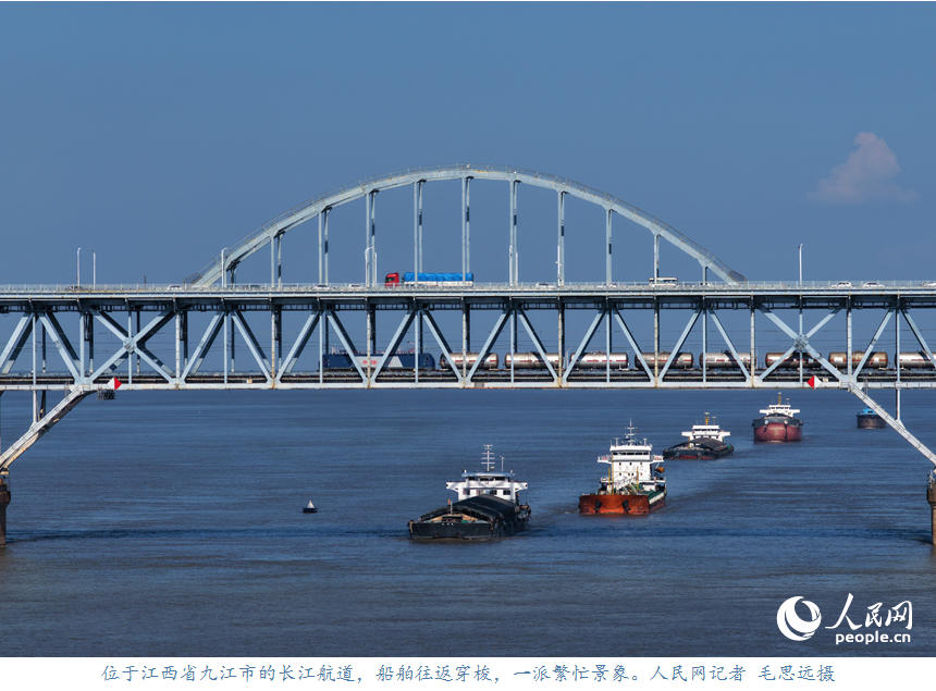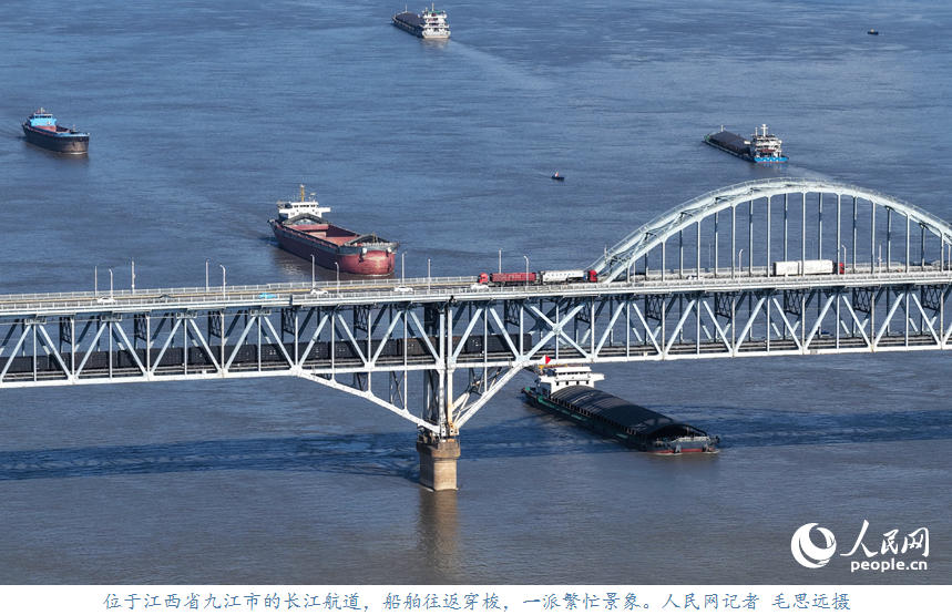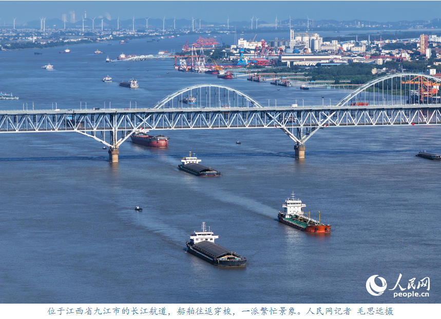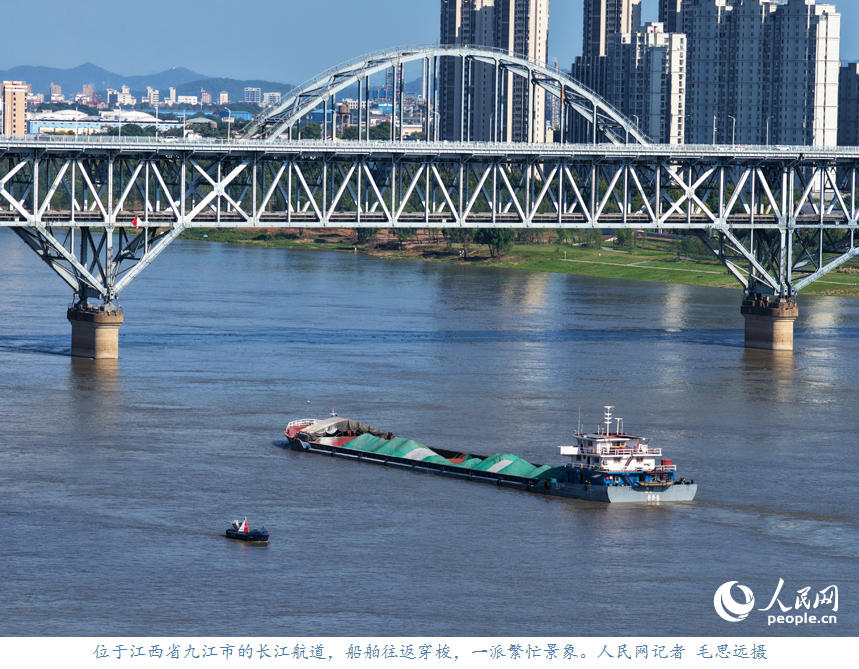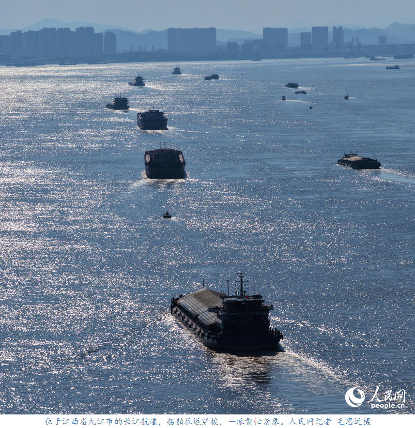 人民网九江10月8日电 (记者毛思远)10月6日,位于江西省九江市的长江航道,装运着生产生活物资的船舶往返穿梭,呈现出一派繁忙景象。