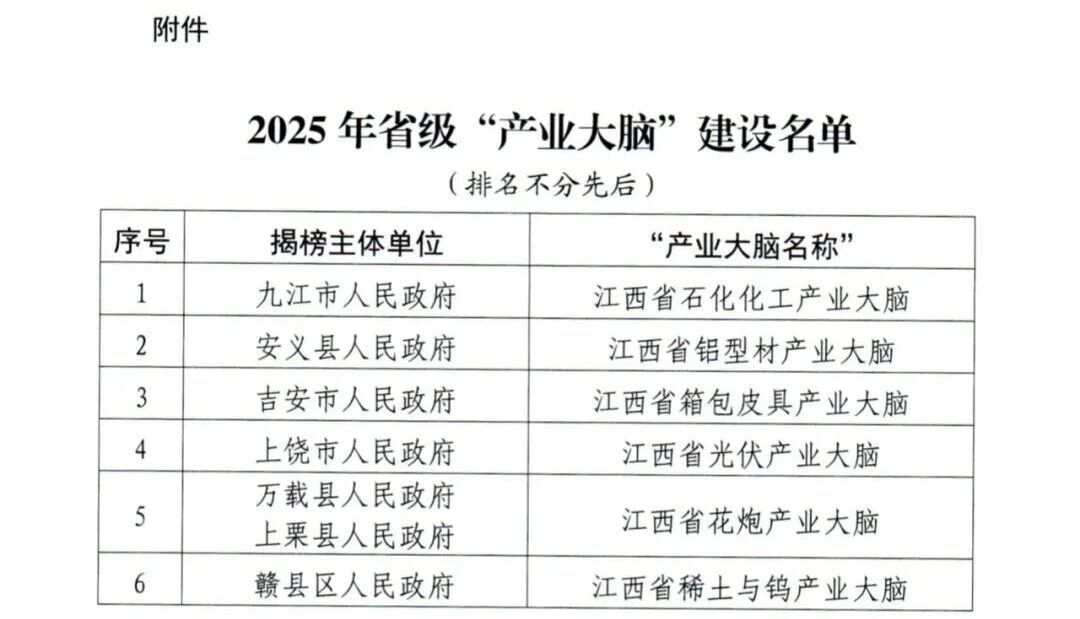 九江新闻网讯(九江日报全媒记者 朱曦薇)近日,省工业强省建设工作领导小组办公室发布了2025年省级“产业大脑”建设名单,九江市人民政府揭榜的江西省石化化工产业大脑等6个项目入选。目前,我市纺织服装、有机硅、石化化工“产业大脑”入选省级建设,总数列全省第一。