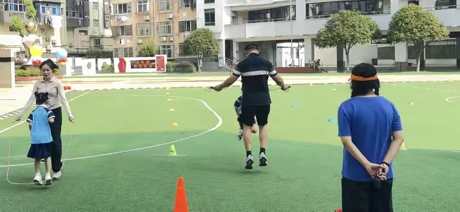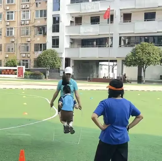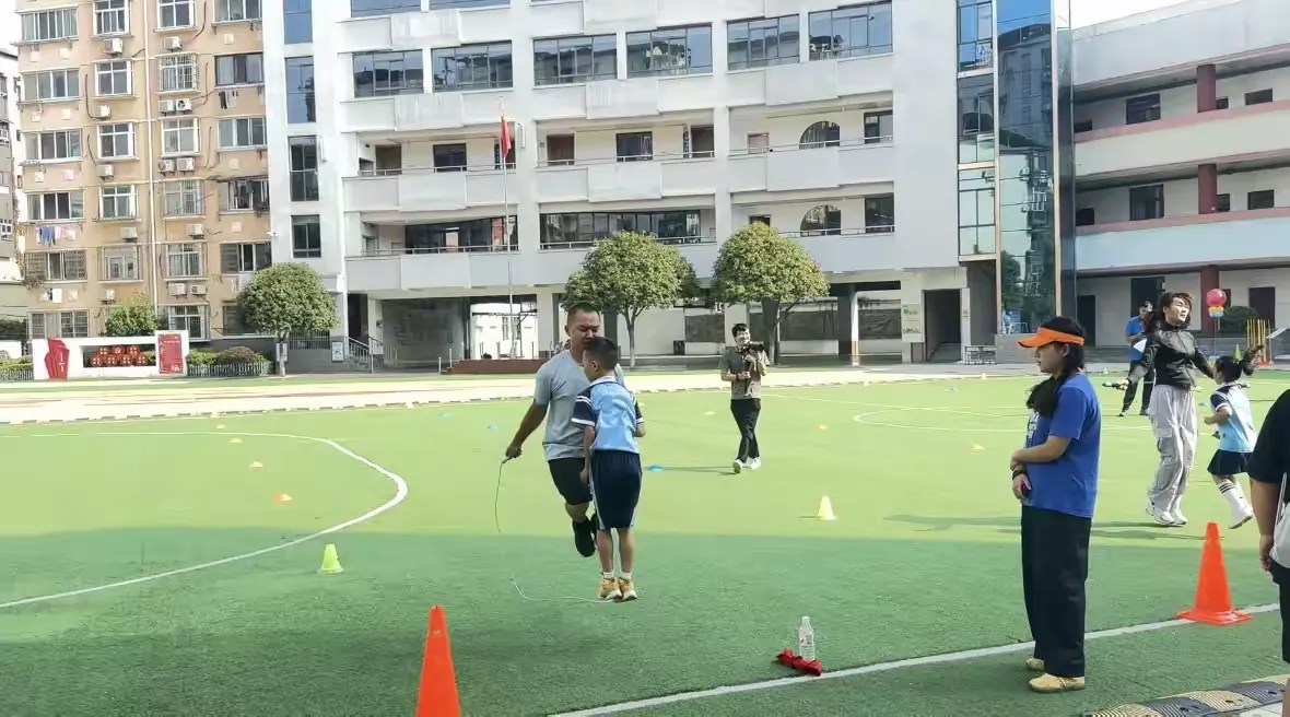 在亲子跳绳的比赛中,绳子在空中画出欢快的弧线。小萌娃们踮着脚尖跳,家长们则配合着孩子的节奏甩绳,每一次同步跳跃都引来周围的加油声。有的家庭一开始节奏稍乱,但很快就找到默契,“1、2、3……”的计数声里,满是亲子间的耐心与配合。