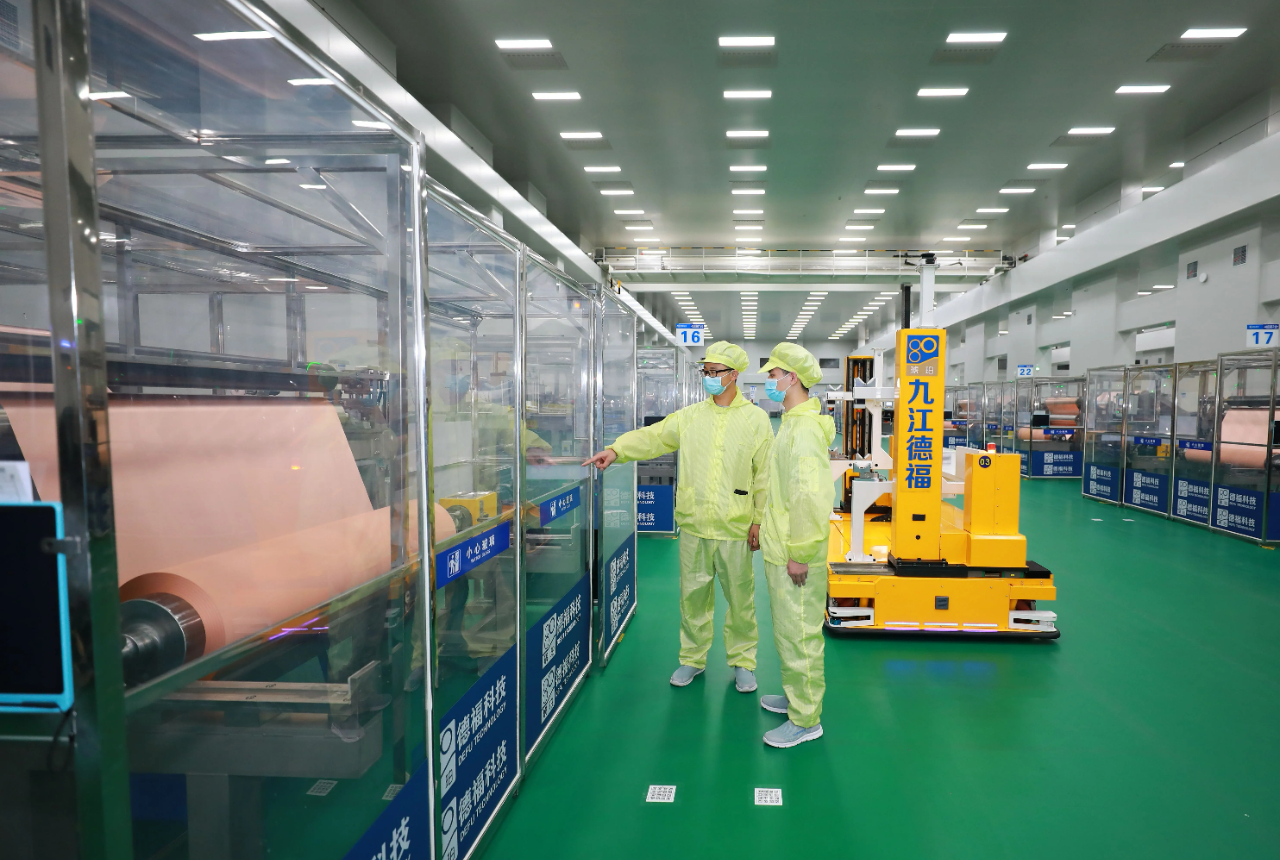 走进九江德福科技股份有限公司,数据化的中央控制室和科技感十足的展厅展现了“德福力量”。整洁的现代化生产车间让调研组眼前一亮。隔着玻璃,这位“国家级专精特新‘小巨人’”用高精度、规模化的铜箔作业向远道而来的贵客诉说着九江电子材料制造从传统模式走向智能化、高端化的故事,其电解铜箔生产能力达年产19.1万吨,产能位居全球第一。