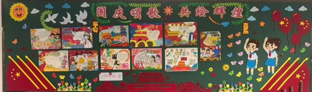 班级里,“喜迎国庆”主题黑板报早已绘制完成,鲜艳的色彩与昂扬的手抄报,共同营造出庄严而热烈的节日气氛。
