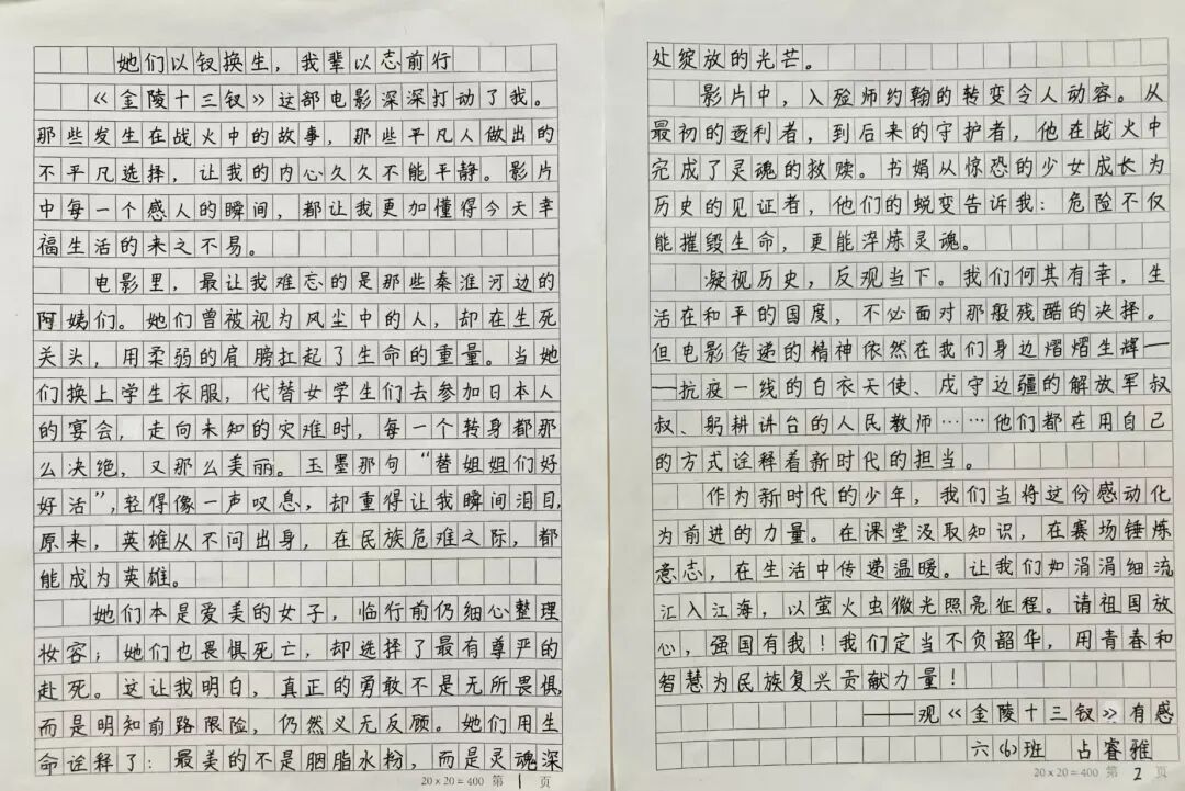 六年级的同学们则通过观看红色电影,接受了一次深刻的精神洗礼。他们结合电影情节与自身感悟,用文字抒写内心的震撼与思考。一篇篇征文,情感真挚,感悟深刻,表达了同学们继承先烈遗志、树立远大理想的坚定决心。