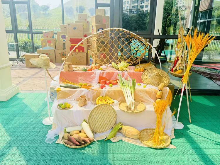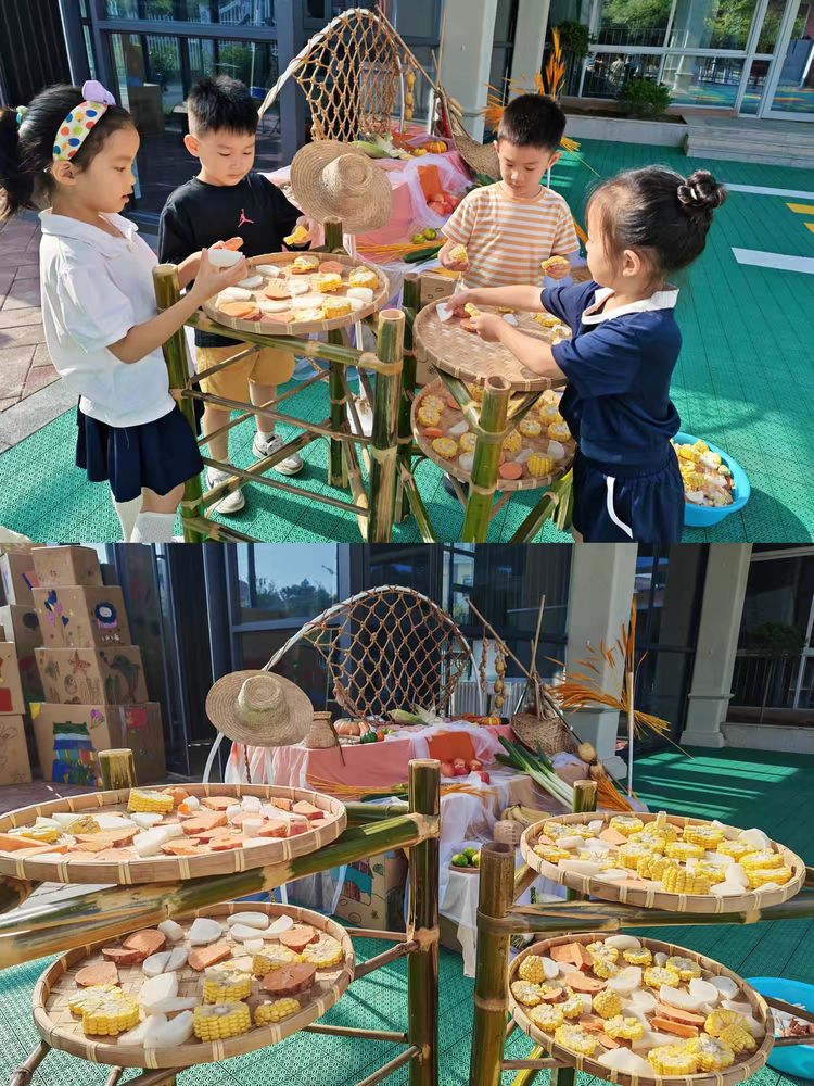 走进幼儿园,处处都是寒露的印记。阳光房的展台成为“打卡点”,香蕉、橘子、麦穗、板栗等食物错落摆放,一眼望去满是丰收的喜悦,孩子们在这里认识了多种秋季作物,悄悄把“秋天的样子”记进心里。