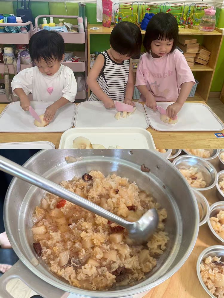 小班组的“厨艺大比拼”热闹非凡!小一班小朋友们精心熬煮寒露汤,银耳、雪梨、冰糖在锅里慢慢融合,甜香弥漫了整个活动室。每一份美食,都是孩子们对“丰收”最直接的体验。