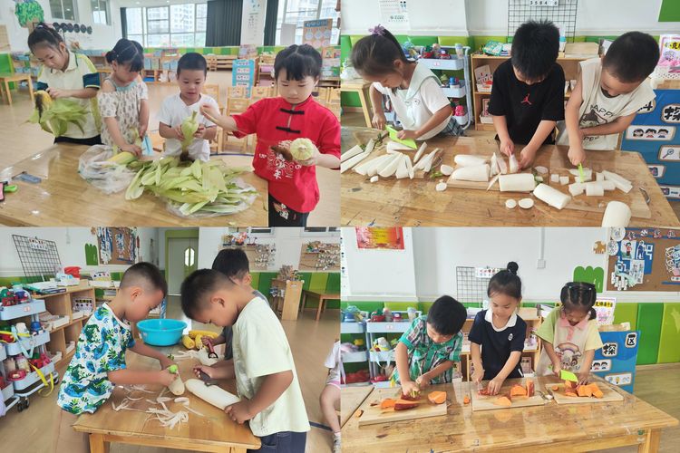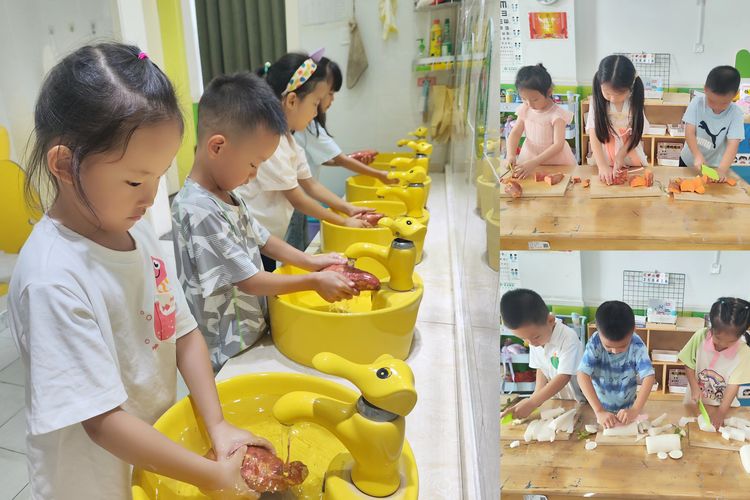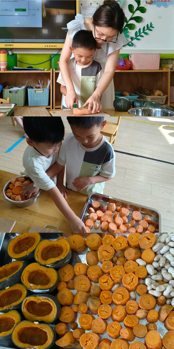 小二班小朋友们搓洗红薯、等待蒸南瓜,看着热气腾腾的食物出炉,脸上满是期待。