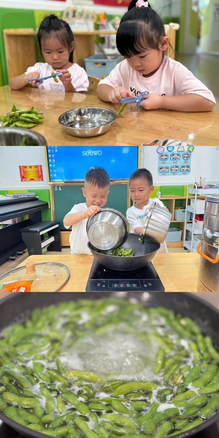 小三班小朋友们专注地给毛豆剪“小尾巴”,煮好后品尝着自己参与制作的毛豆,直说“好香”!
