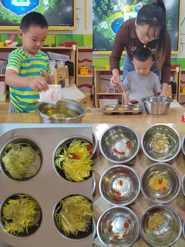 小四班小朋友们尝试制作菊花糕,在老师的帮助下搅拌、塑型,感受软糯的口感与菊花的清香。