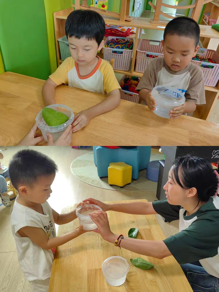 中班组的活动充满探索与创意。中一班的“露珠小实验”让孩子们直呼神奇:半杯水加冰块,盖上树叶等待片刻,打开叶子的瞬间,晶莹的露珠让孩子们惊喜尖叫,他们凑近观察、轻轻触摸,直观感受到了“寒露露水多”的特点。