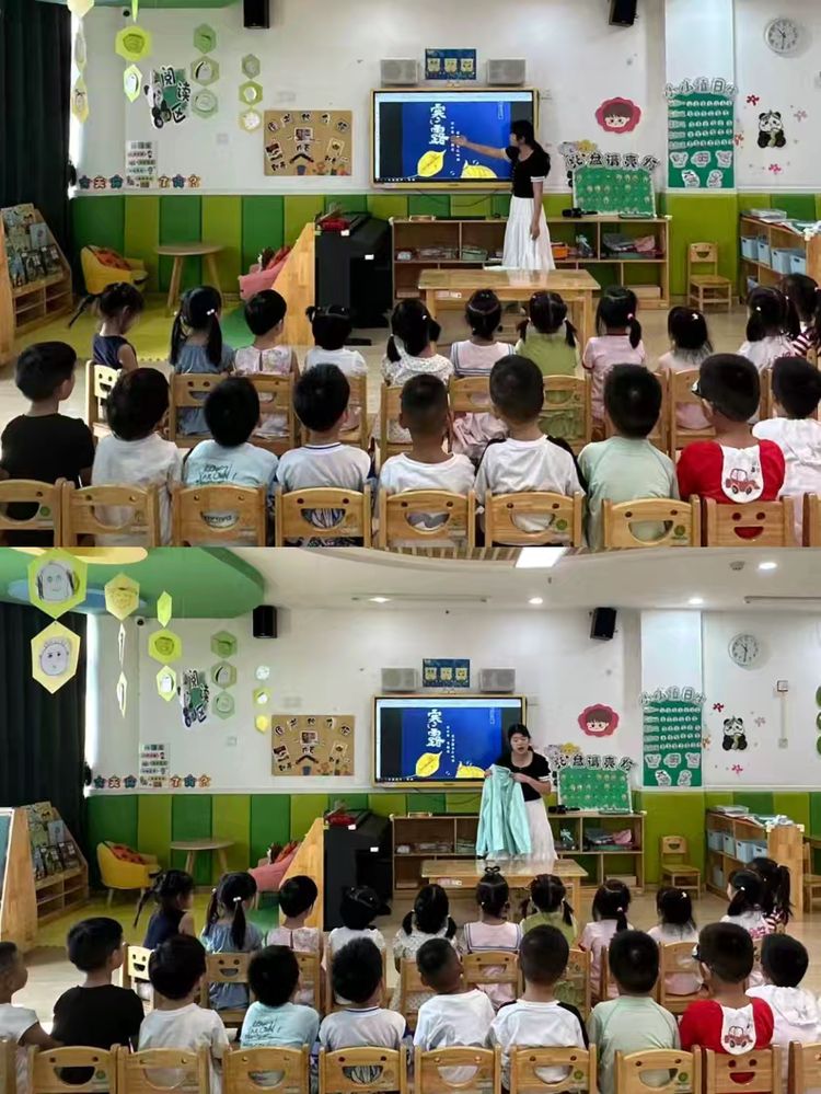 中二班的老师带着孩子们认识寒露,拿起薄外套模拟“添衣保暖”,在互动中知道“天气变凉要穿厚一点”。