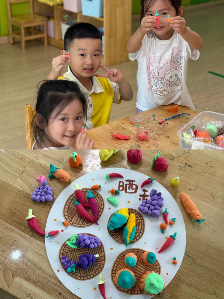 中三班以“晒秋”为主题手工,孩子们用黏土模拟出婺源晒秋的五彩斑斓,金黄的玉米、火红的辣椒跃然眼前。