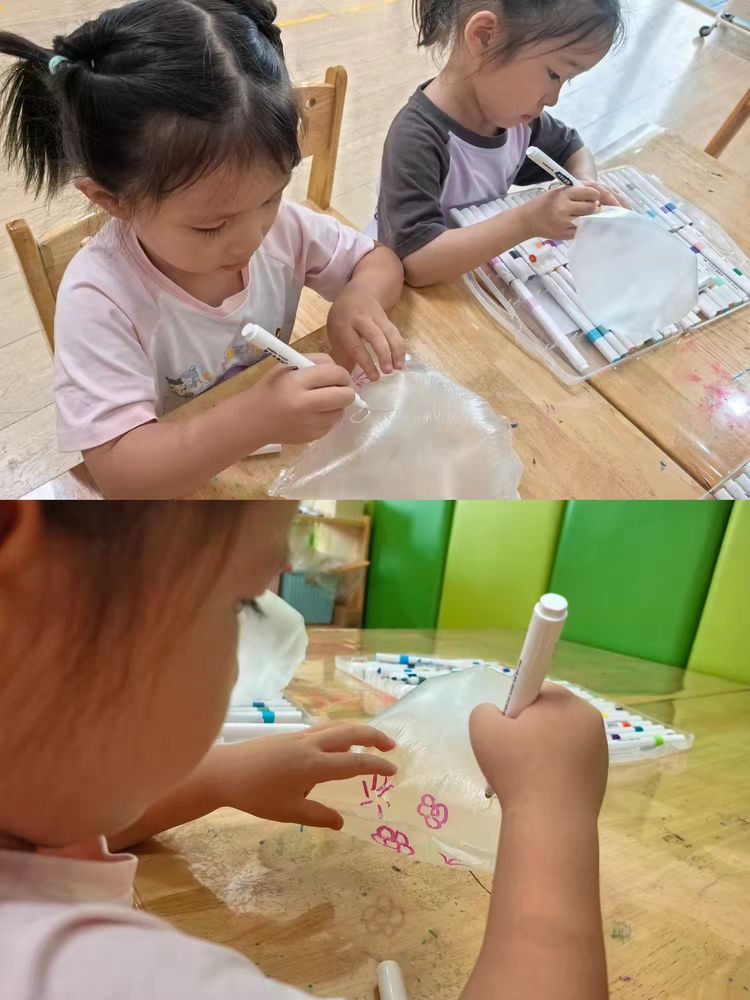 中四班的“保鲜袋画秋天”创意十足,孩子们给扎紧的保鲜袋底部涂上秋黄、橙红,展开后如同打翻了秋日的调色盘,每一幅作品都独一无二。