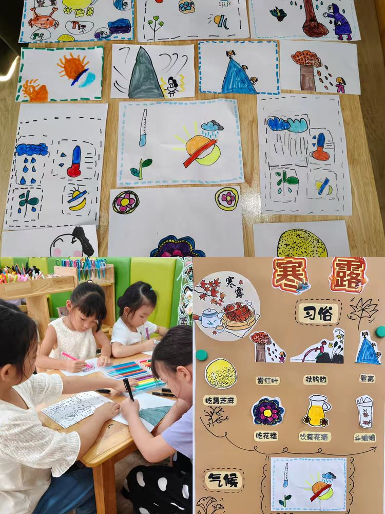 大二班分组制作“寒露大发现”海报,孩子们收集图片、讨论“寒露的秘密”,从气候特点到农事活动,再到喝菊花酒的习俗,一点点把寒露知识“拼”成海报,成就感满满!