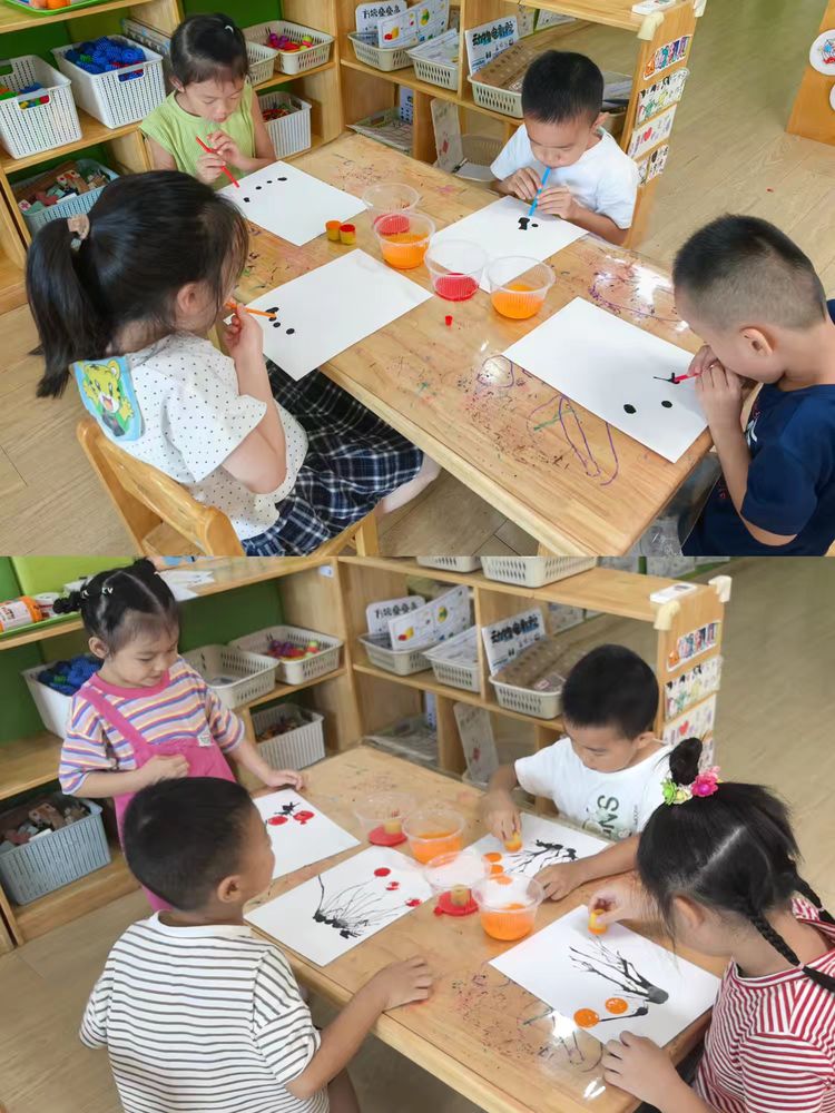 大四班的“柿子红了”手工活动兼具诗意与美感,孩子们用墨汁吹画枝干,再用黏土捏出红彤彤的柿子,一幅幅作品充满童趣,也藏着对秋天的热爱。