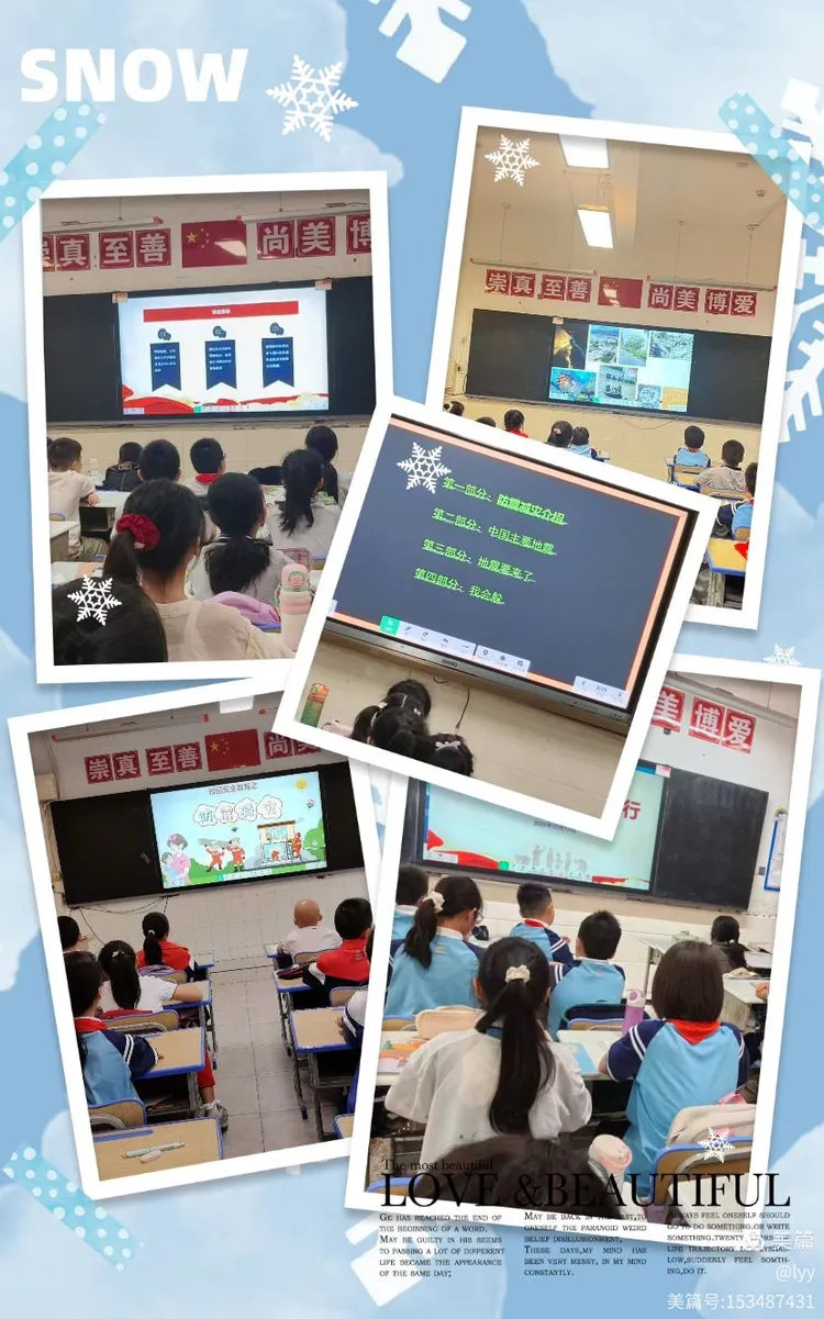 班队会上各班级以“防震减灾,安全同行”为主题召开班会。班主任通过动画短片、案例分析等形式,生动讲解地震成因、预警信号及避险要点;借助情景模拟,带领学生练习防震动作,演示火灾逃生技巧,切实掌握自救互救的“硬本领”。