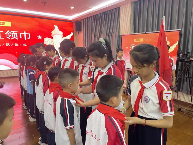 在庄严的队旗下,黄当当老师宣读了新队员名单。紧接着,最激动人心的时刻到来,五、六年级的优秀少先队员代表们手捧鲜艳的红领巾,庄重地为新队员佩戴。当红领巾在胸前飘扬,新队员的脸上洋溢着激动与自豪的笑容。