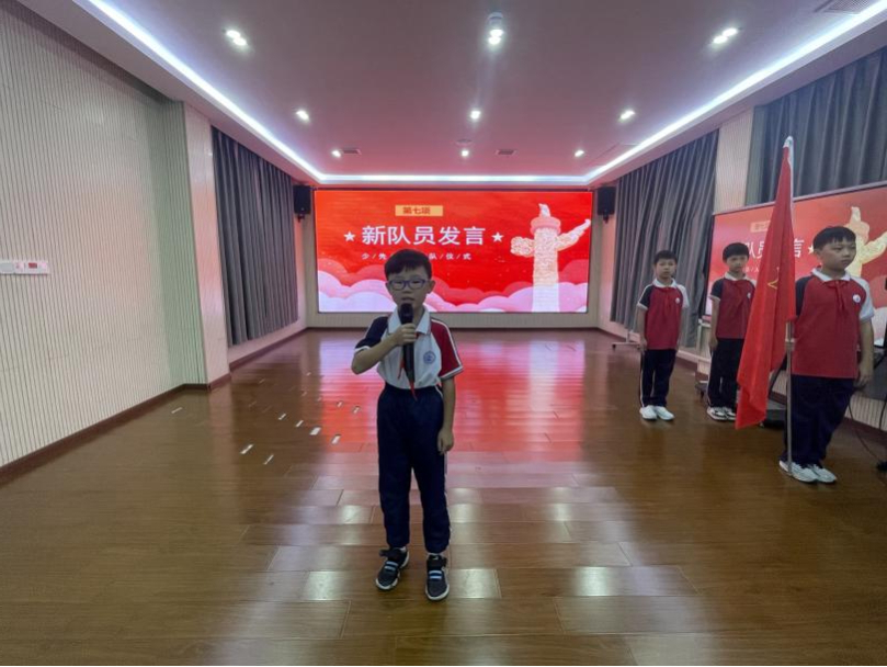 仪式上,学校还为新成立的中队授予了中队旗。一面面队旗的交付,象征着新的集体正式组建,也承载着学校对新中队的殷切期望。随后,新队员代表蔡兴锐同学发言,他用稚嫩而坚定的声音,表达了对老师、家长的感谢,并代表所有新队员承诺,将努力学习、关心集体,争做一名优秀的少先队员。