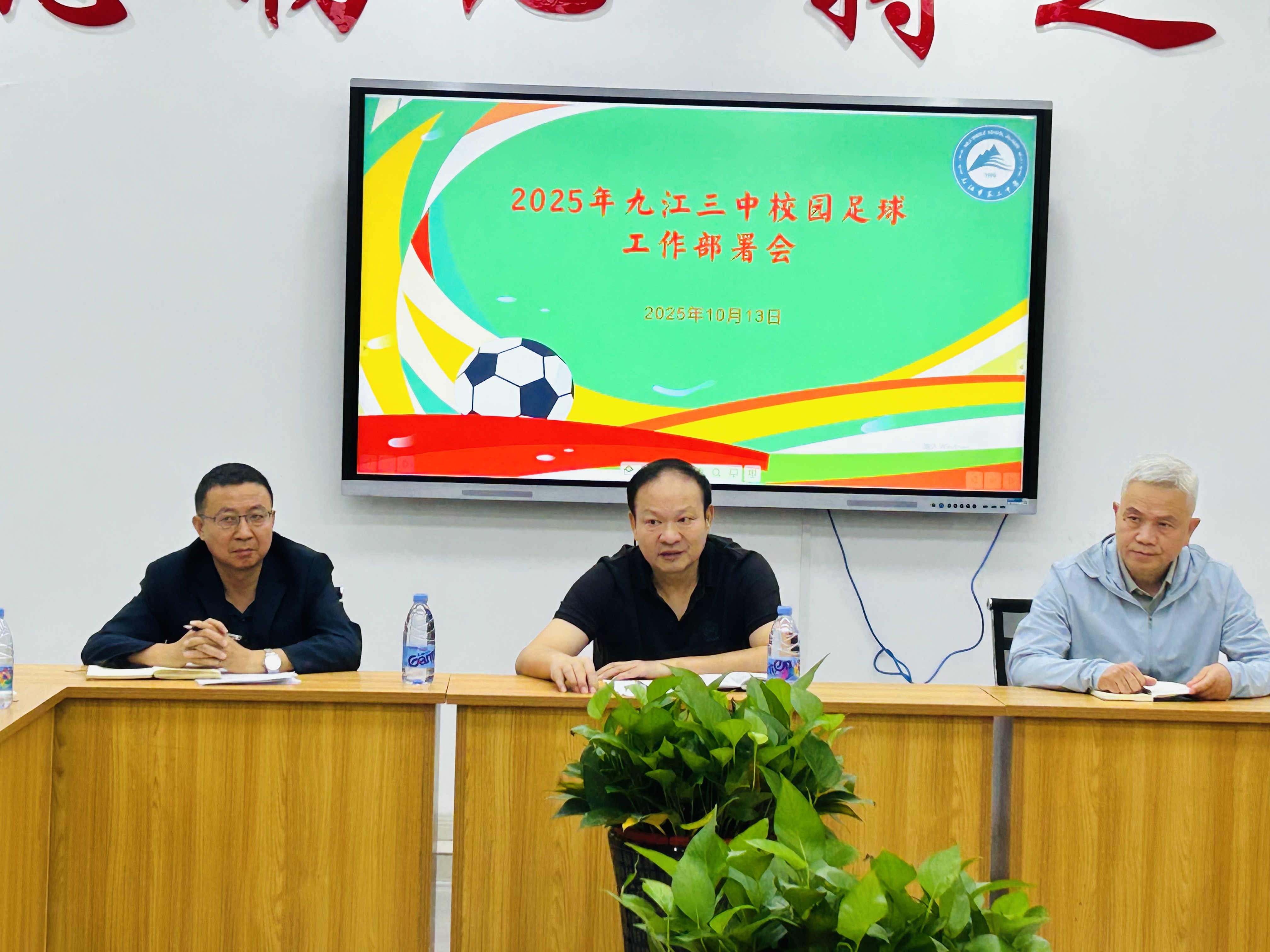九江新闻网讯(张胡伟)10月13日上午,九江市第三中学“落实队伍训练、提高比赛成绩”校园足球专项会在甘棠湖校区体艺中心办公室召开。会议由校党委书记胡文能主持,副校长夏刚、李代煌及各处室主任、年级部主任、体艺中心各训练队教练参会。