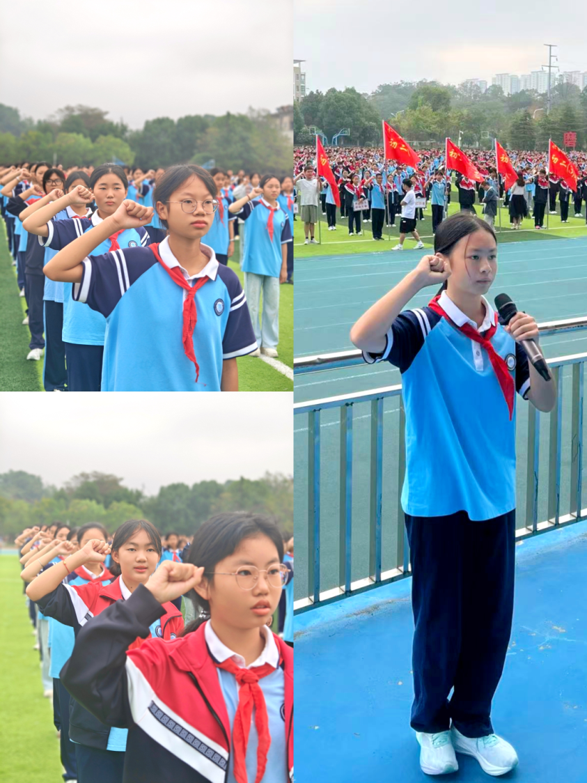 在少先队员代表张婷钰同学的带领下,全体队员高举右拳,庄严承诺,表达了规范言行、积极进步的决心。随后,大会宣布七年级以班级为单位成立少先队中队,进一步加强基层组织建设,增强队员的归属感。