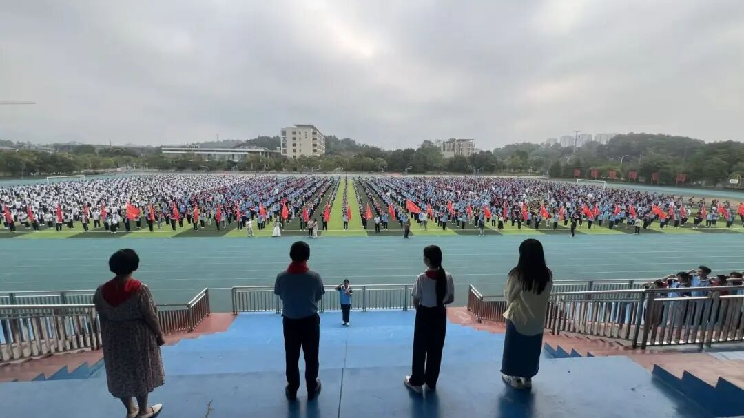 初一、初二年级队员齐声高唱《中国少年先锋队队歌》,展现出少先队员的朝气与信念。初三年级同学随后唱响《光荣啊,中国共青团》,两首歌曲的接力,象征着从少先队到共青团的光荣延续与精神传承。