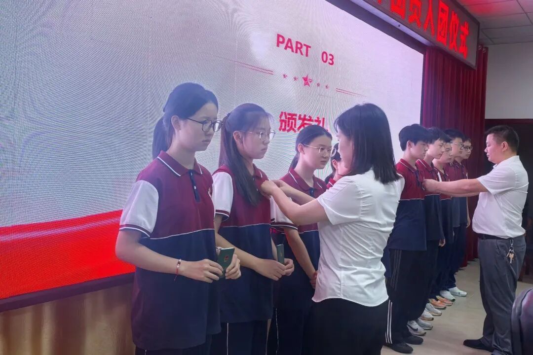 初三年级主任段金林老师与团委书记梅群老师共同为新团员代表颁发团员证、佩戴团员徽章。