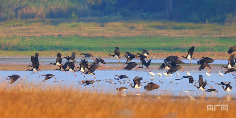 “鸟中大熊猫”黑鹳正在鄱阳湖国家级自然保护区内悠闲觅食(央广网发 王小龙 摄)