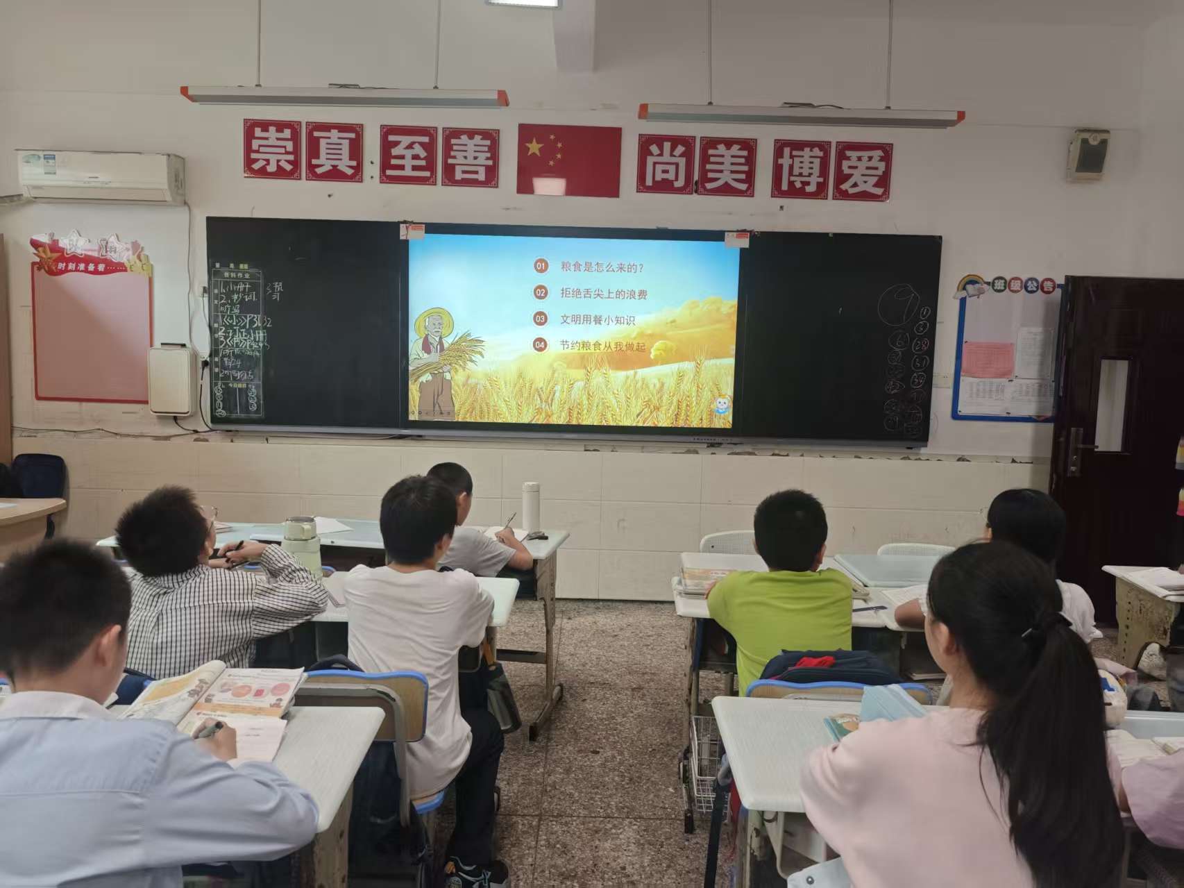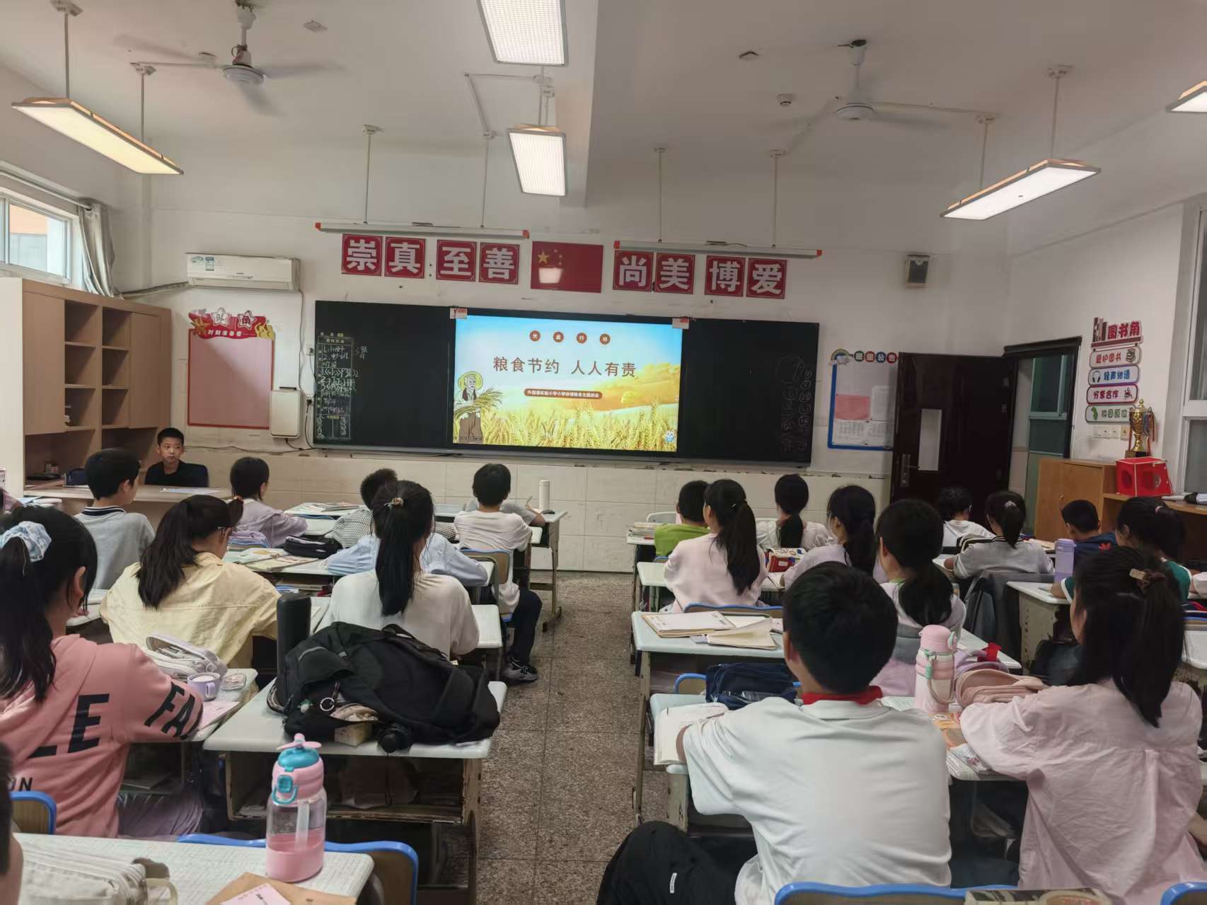 全校开展了主题班会,老师通过形象生动的故事、真实的数据、震撼的图片和视频以及朗朗上口的诗歌让学生感受到了粮食的珍贵,体会到粮食的来之不易,从而促进学生养成不挑食、不浪费的好习惯。