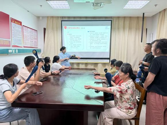 实操环节中,重点带领患者体验中医特色缓解疼痛方法:练习“八段锦”可以舒展筋骨、调和气血,现场指导“拍八虚”手法——通过拍打腋窝、肘窝等经络汇聚处,达到疏通经络,促进气血运行、缓解肌肉酸痛的效果。患者们积极参与互动,现场氛围活跃。