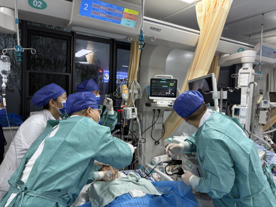 患者年龄大,呼吸衰竭,经口气管插管一周,预计短期难以脱机,在科主任、副主任医师陈乐华的带领下,经过ICU医生团队充分有效评估,有经皮气管切开呼吸辅助通气指征,并与患者家属沟通后,联合消化呼吸内科为患者进行纤维支气管镜引导下经皮气管切开术。