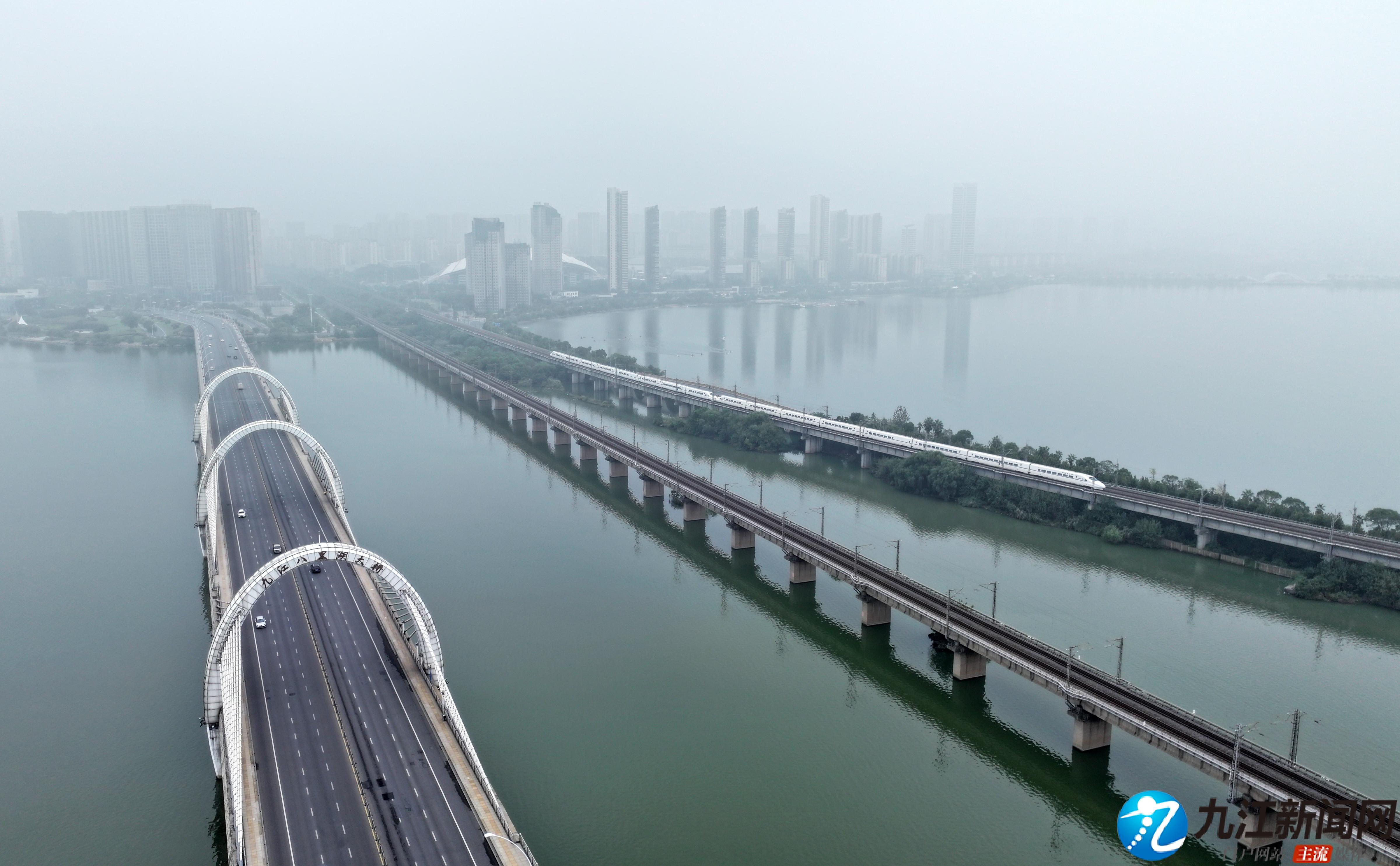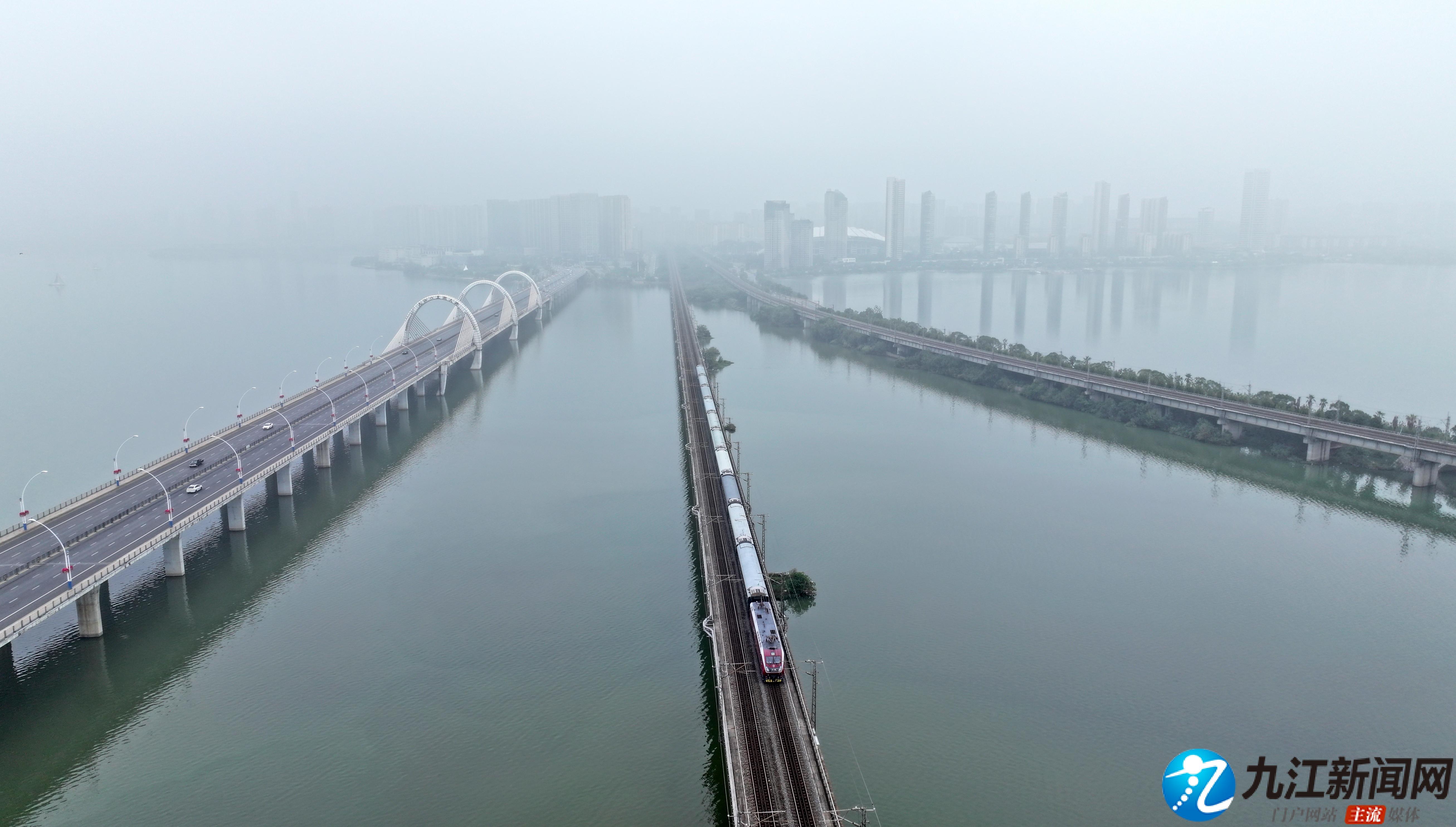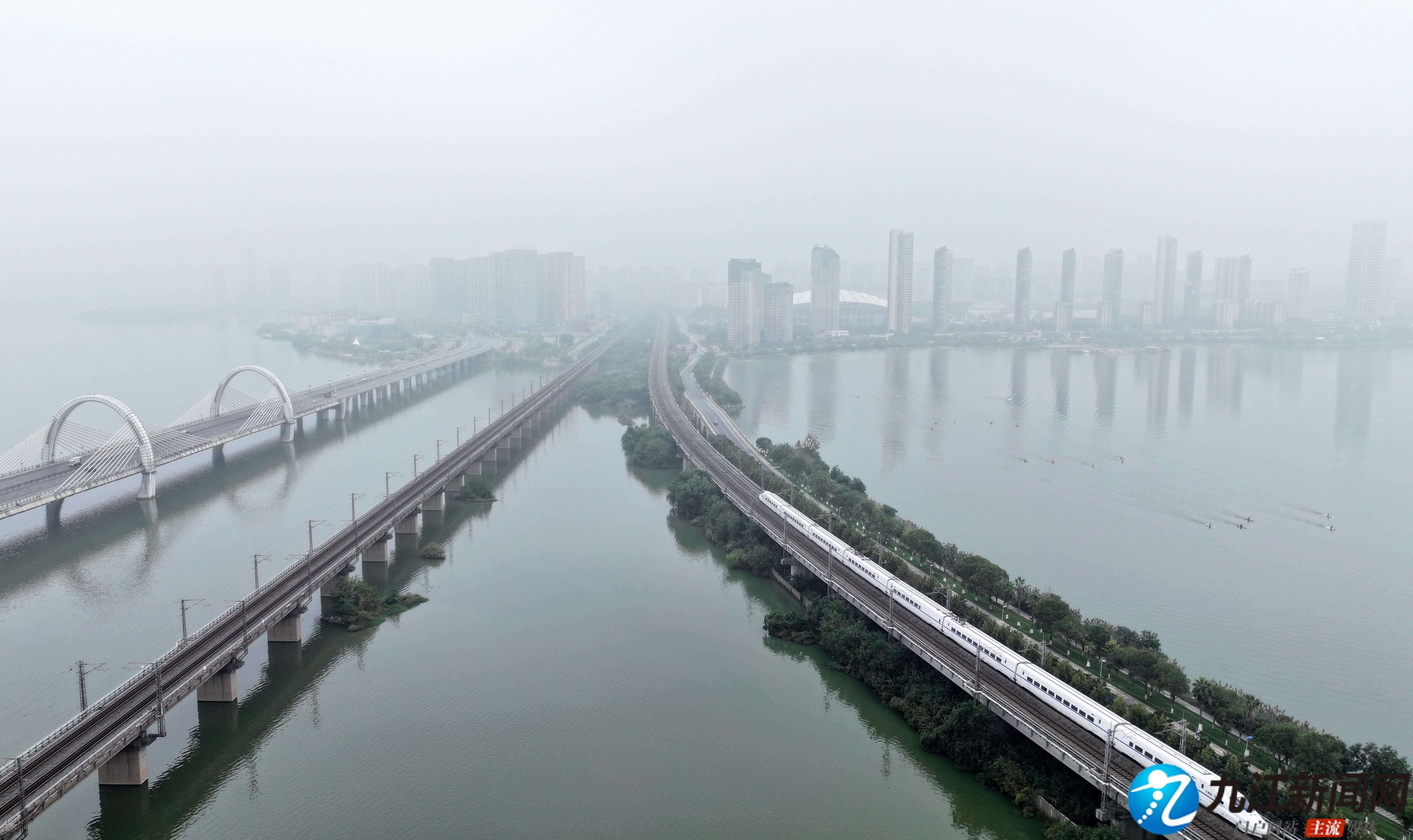 10月17日,浔城晨雾弥漫,八里湖在浓雾中晕染出水天一色的朦胧画卷。远处城市建筑若隐若现,一列高速列车划破雾霭疾驰而过,为这片静谧的湖城风光注入流动的韵律,定格成雾中浔城的诗意瞬间。(九江日报全媒记者 刘家 摄)