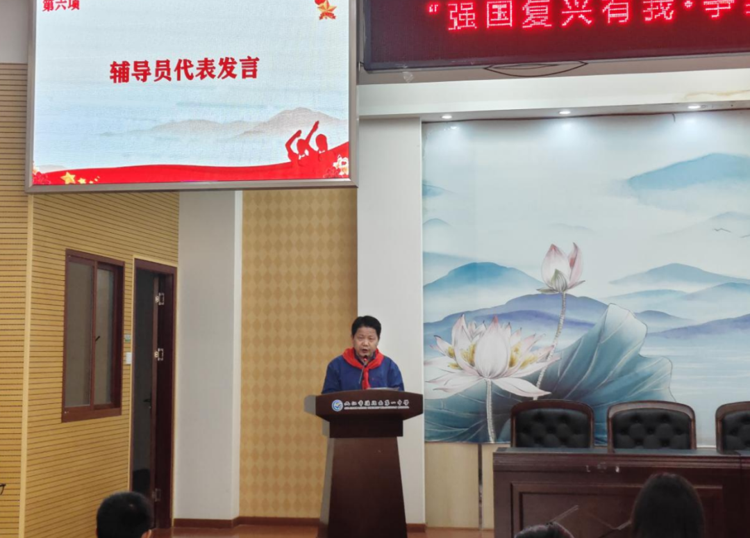 七年级年级主任胡宗鑫作为辅导员代表发言,承诺践行“为党育人、为国育才”使命,以“理想信念引路人、实践成长同行者、心灵成长守护者”身份,帮助少先队员们树立“强国复兴有我”信念、汲取青春成长力量。