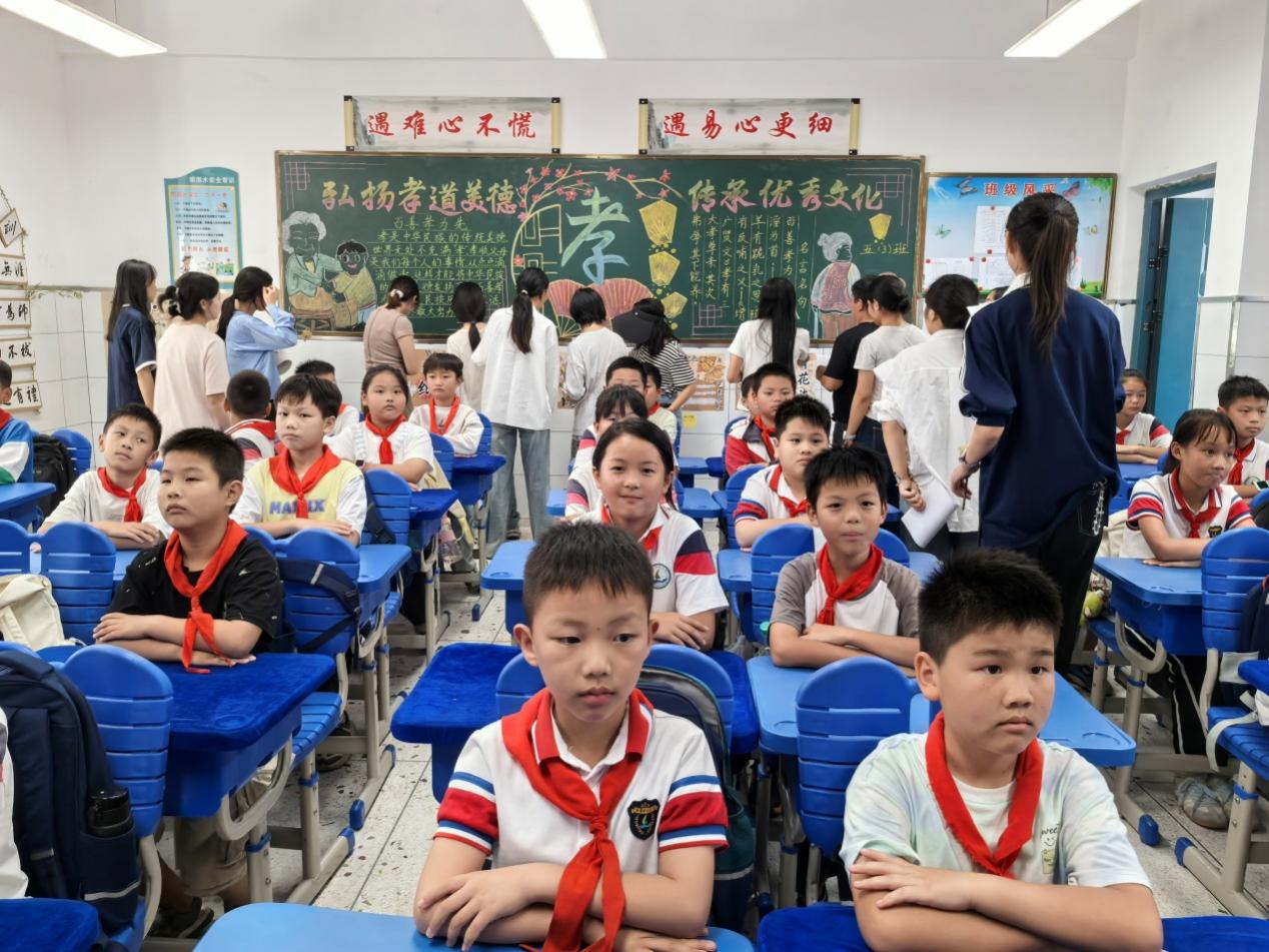 由全体教师组成的评委团走进每一间教室,从整体构思到细节表达,从文化内涵到审美呈现,进行了多维度、沉浸式的观摩与评价。各班围绕主题,巧妙融合经典诗文、传统美德、乡土非遗等元素,打造出一个个既有文化厚度又有班级温度的育人空间。