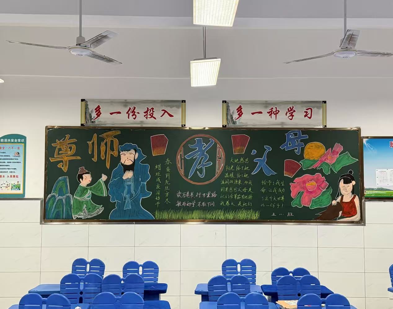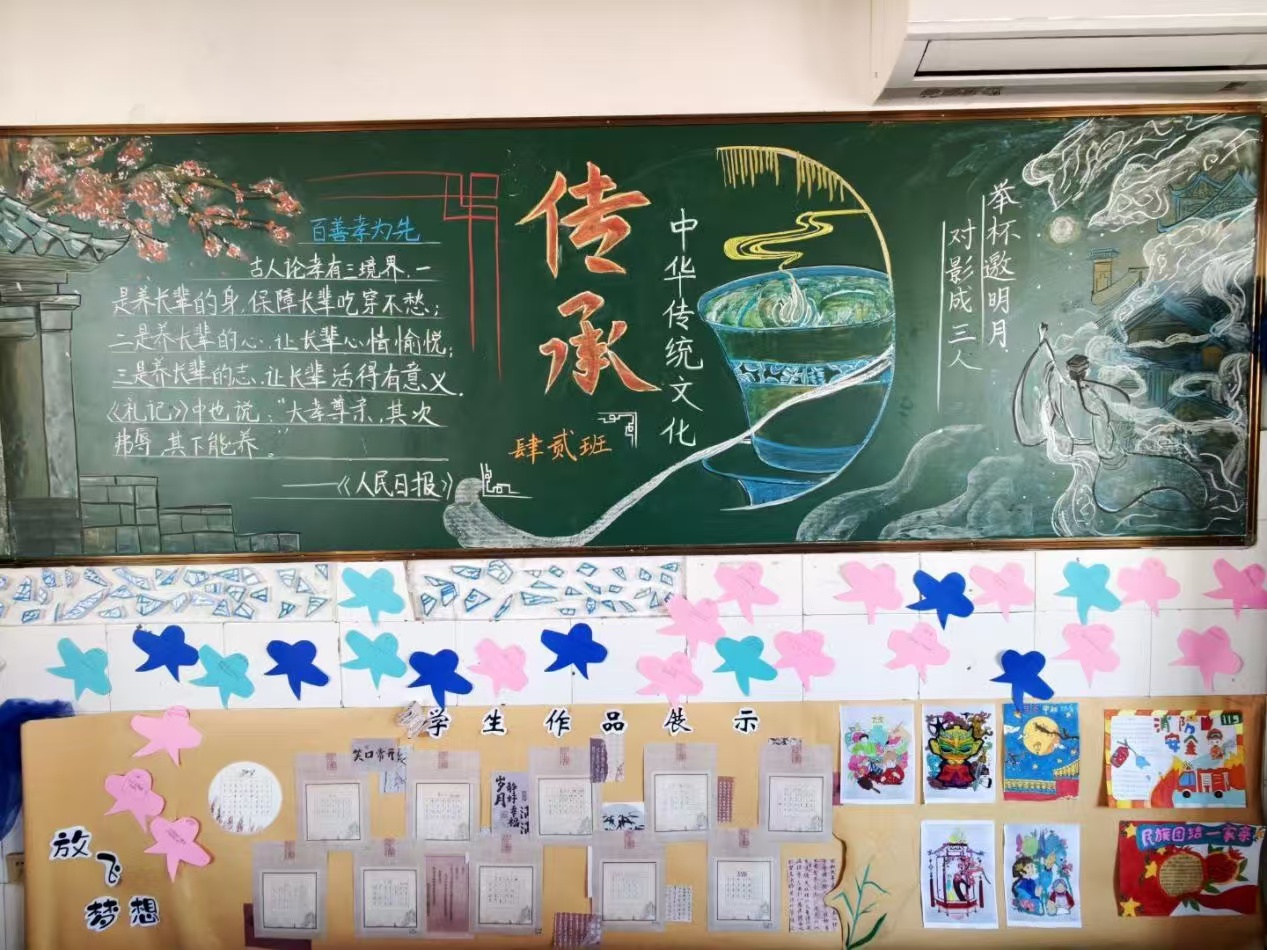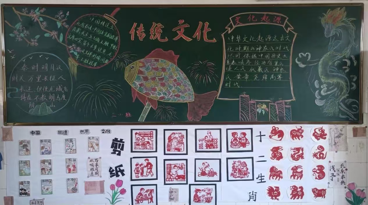 走进教室,“孝亲敬长”主题黑板报以手绘传递家风温情,“诗词雅韵”角留白处皆见墨香;非遗剪纸、民俗手作更在方寸之间展现匠心传承。每一面墙壁都在说话,每一个角落都在育人,传统文化不再是书本中的符号,而成为可触、可感、可参与的生活体验。