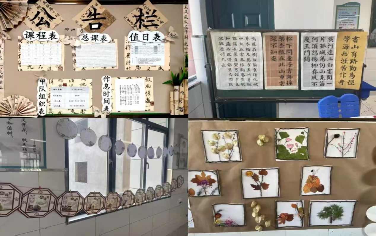各班在布置中充分尊重学生主体地位,鼓励学生亲手书写与绘制。一幅幅稚拙却真诚的书法,一件件充满想象力的手工作品,不仅是环境的点缀,更是童心在与经典对话中的自然流露。