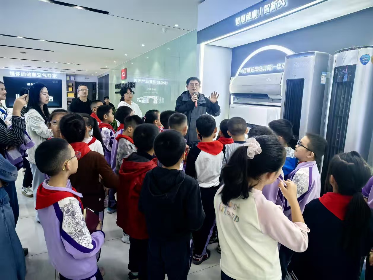 互动环节,讲解员展示的TCL智能空调引发热潮——该空调可语音控制、拨打电话还能做计算题,队员们争相提问,现场气氛热烈。随后的空调知识课堂上,专业老师生动讲解工作原理与节能科技,队员们围绕“制冷制热原理”“智能模式省电技巧”等踊跃发问。手绘空调环节,队员们用彩笔在机组上描绘创意蓝图,为活动增添色彩。