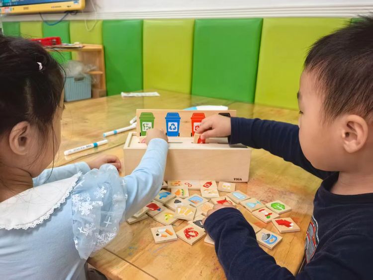 班级角落的“迷你垃圾站”,成了孩子们的欢乐学习天地。仿真塑料积木块、彩色纸质小卡片在他们手中来回传递,大家专注地为“垃圾宝宝”寻找正确的“家”。在教师的耐心指导下,“颜色对应垃圾”的认知在孩子们心中渐渐清晰。午餐后的“分类小任务”,更让环保习惯悄然养成。孩子们跟着“果皮进绿桶,纸巾进灰桶”的趣味儿歌,主动清理餐盘里的垃圾。幼儿园还为他们准备了“家庭打卡表”,将分类行动延伸到家中,累计5次打卡就能获得专属贴纸,这一枚枚小小的贴纸,成为孩子们成长路上最珍贵的勋章。