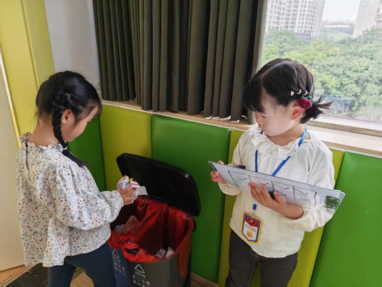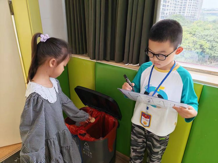 大班的哥哥姐姐们扛起了“班级垃圾分类管理员”的重任,自愿报名、轮流上岗,不仅监督同伴投放垃圾,还认真记录每日投放准确率——“厨余垃圾错误2次,可回收物正确15次”,每周的公示栏上,数据见证着大家的进步。