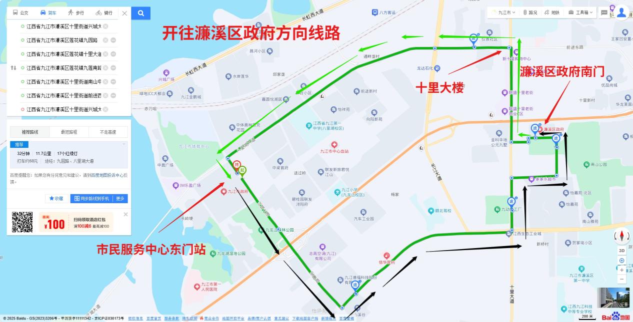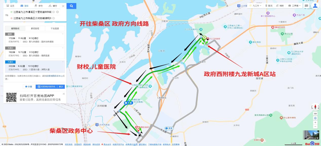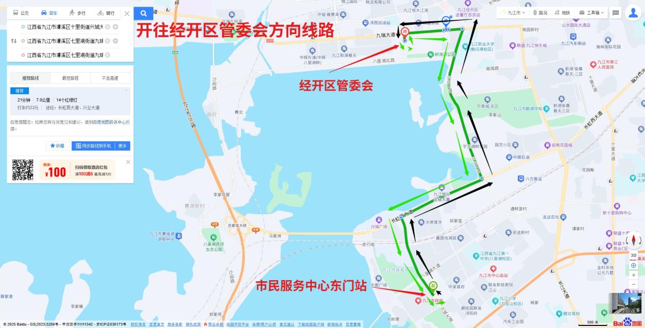 往返路线走向:祥和路东侧(九龙新城A区)--八里湖大道---柴桑路---渊明大道(柴桑区行政服务中心)。车辆停靠沿线公交站点。 详见下图: