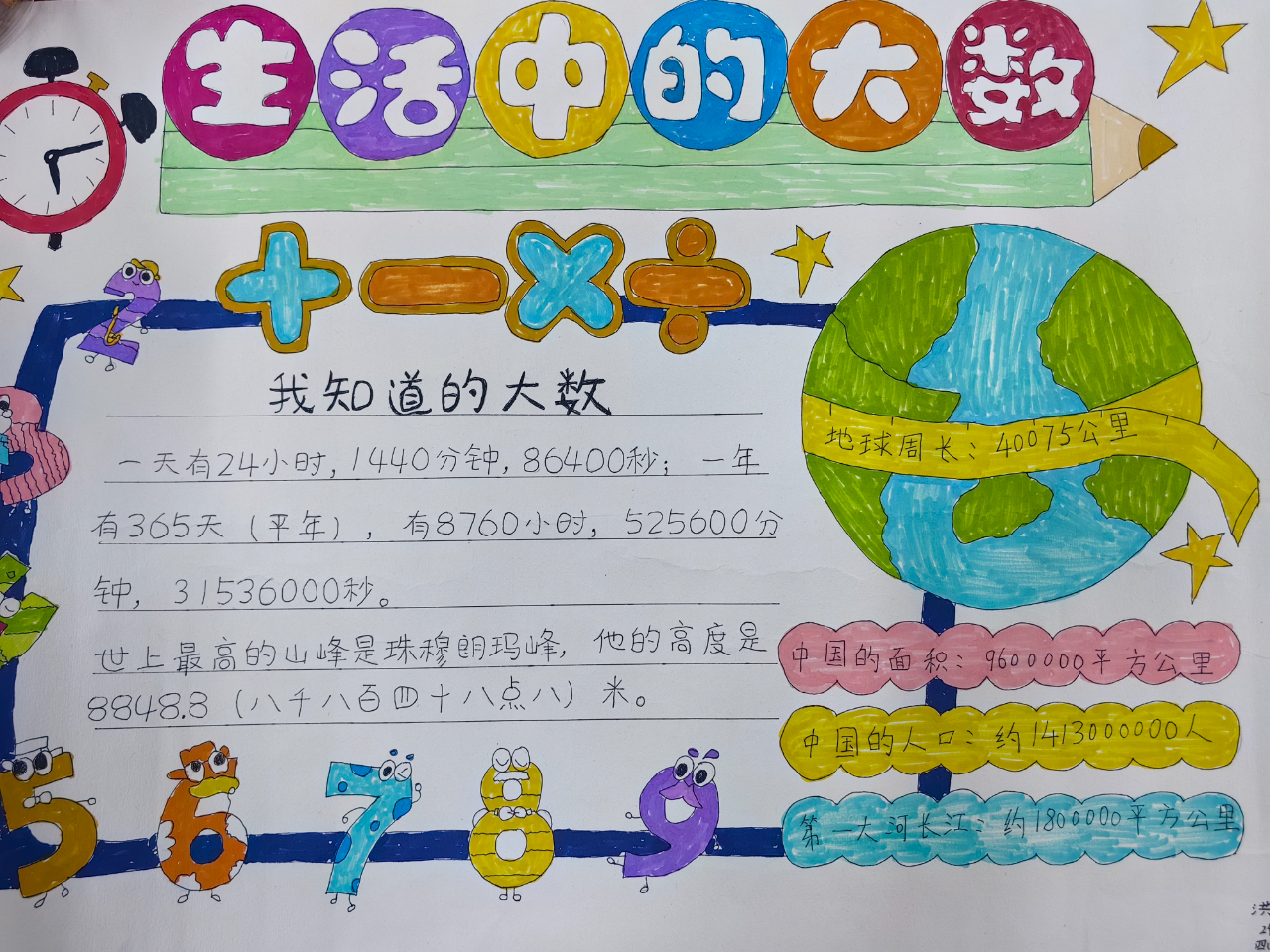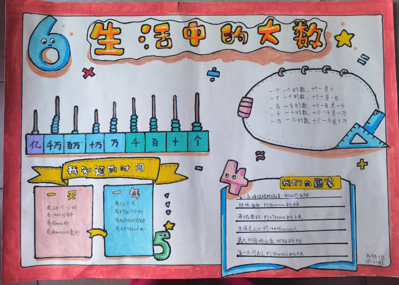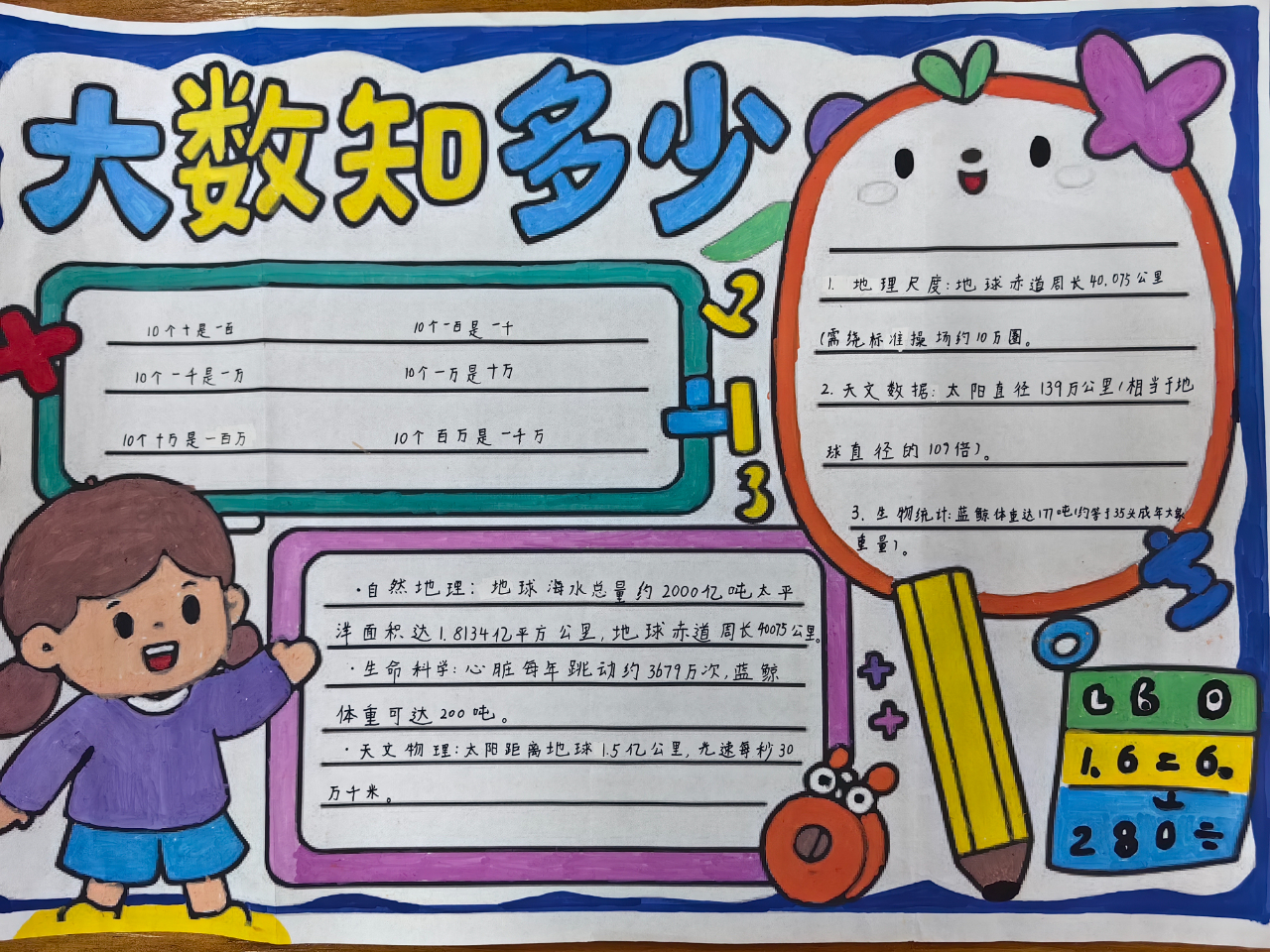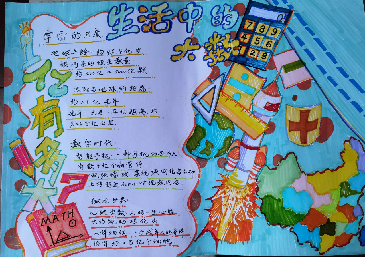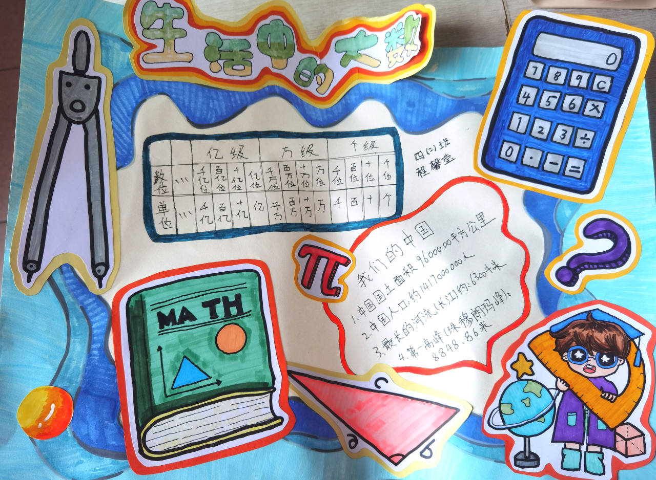 活动中,四年级学子化身“数学探索家”,用善于发现的眼睛捕捉生活中的大数:从地球的半径、宇宙的星体数量,到家乡的人口总数、一年的秒数计算……他们以手抄报为载体,将“数”与“形”巧妙融合,通过文字阐述、图画点缀、数据标注,把抽象的大数转化为直观的视觉作品,既展现了独特的创意,更深化了对大数意义的理解。