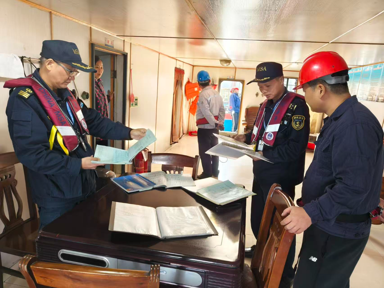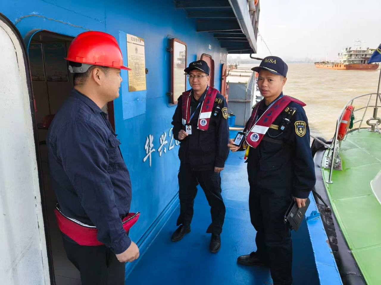在汇口渡口,执法人员对“赣九江渡0098”开展了渡船随船监管,在永和洲危货锚地,执法人员对到港危险品船舶进行检查。在永和洲普货锚地,执法人员登轮对船舶证书文书、设备设施、防污染措施落实及船员履职等情况进行详细查看,检查结束后及时反馈安全缺陷,签发检查报告,要求船方整改到位 。