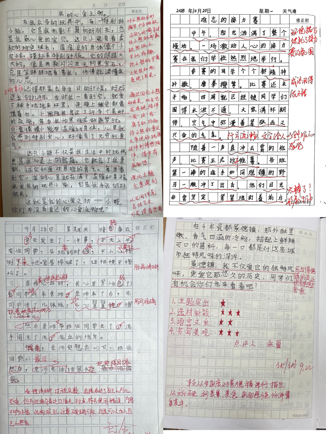 语文作业中,横平竖直间尽显汉字韵味,整洁的页面与工整的字迹,既见证学生的自律,也凝聚教师的用心。教师紧扣教材、衔接课堂,精心设计多样化作业;习作板块,学生主动互评、取长补短,教师逐字细批,既修正错漏,又指导结构与立意。批改兼顾对错判断与成长激励,及时点拨引导,助力学生查漏补缺,语文素养扎实可见。