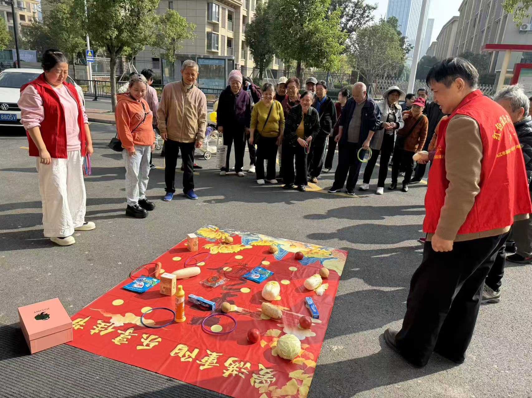 活动前期,社区工作人员与志愿者精心筹备,不仅在电子屏播放“情暖重阳,爱在身边”主题,还精心挑选了适合老年人的实用奖品——从日常所需的洗洁精、清洁球、洗衣粉,牙刷、牙膏到水果、蔬菜等,满满当当摆放在活动区域的长桌上,彩色套圈整齐堆叠一旁,营造出温馨热闹的节日氛围。