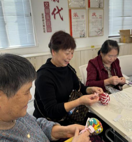 第三个游戏是“巧手做艾草锤”。志愿者先向大家讲解艾草的药用价值与重阳节制艾的民俗寓意,随后演示艾草锤的制作步骤:将纯棉布裁剪成方形、填充干燥艾草、用彩绳对角捆绑固定、最后装饰流苏。老人们听得认真,跟着步骤一步步操作,遇到疑问时,志愿者便上前耐心指导。75岁的张奶奶手指有些灵活度下降,志愿者便帮她扶住布料,陪她一起慢慢填充艾草;李爷爷则发挥创意,用彩绳编出花纹,让自己的艾草锤格外精致。欢乐时光里,活动室里满是艾草的清香与欢声笑语,一个个饱满厚实、带着淡淡艾香的艾草锤陆续完成,老人们拿在手里反复翻看,脸上满是成就感。