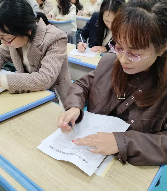 活动当天,全体数学教师齐聚录播室,以饱满的热情投入到“以练代学”的学习中。在答题环节,老师们神情专注而认真。大家围绕题目中涉及的“评价标准”“课程理念”“核心素养”等关键问题,结合自身教学实际进行深入思考,将新课标理念与教学实践紧密结合。通过做题、研题的方式,老师们更直观地感受到了新课标对教学提出的新要求,也进一步明确了今后教学改进的方向。