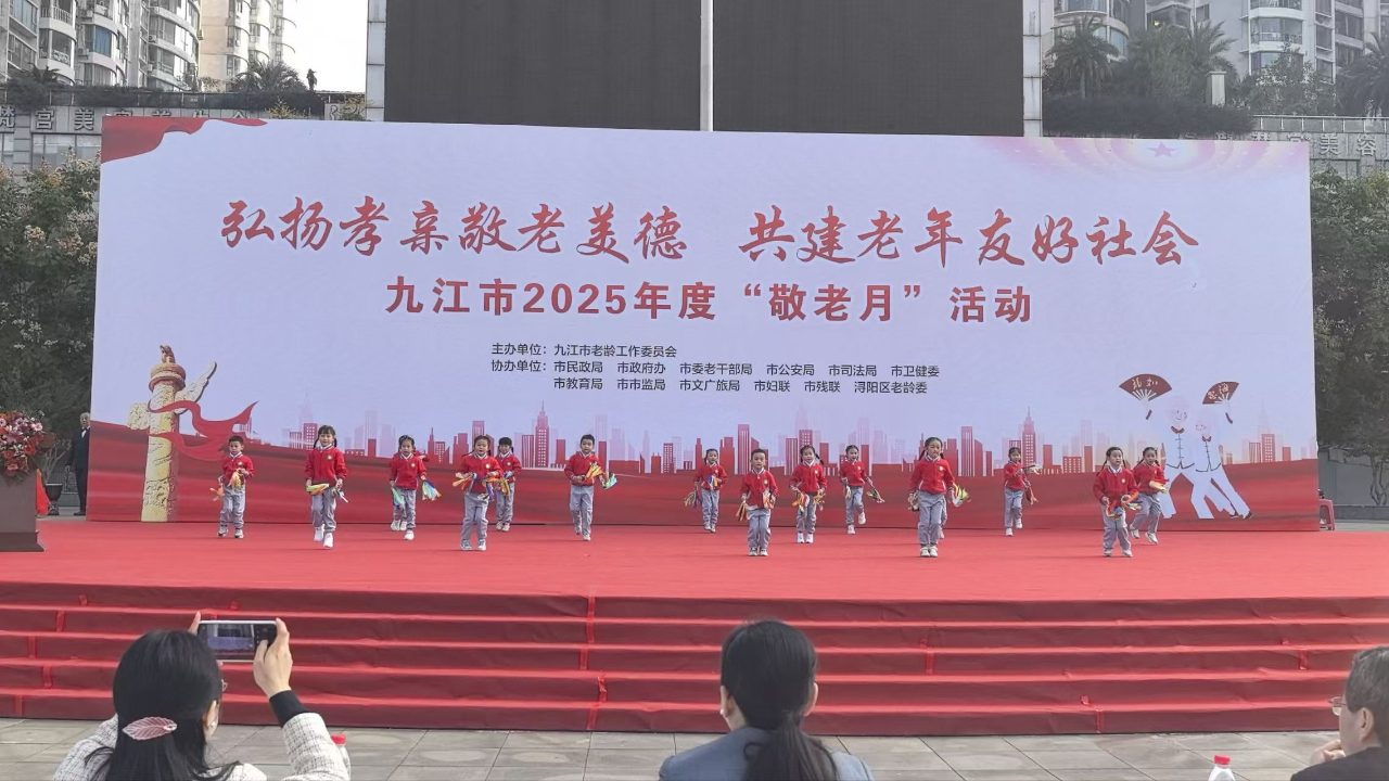 10月28日上午,由九江市老龄化工作委员会主办的“弘扬孝亲敬老美德 共建老年友好社会”主题庆典活动上,幼儿园大班孩子们带来了精彩的《健康律动操》表演,他们身着统一的服装,手持色彩鲜艳的摇铃,为在场的老年朋友们献上了一场充满童真与活力的操。这场表演不仅为节日增添了浓厚的喜庆气氛,更在孩子们幼小的心灵中播下了尊老、敬老的种子。