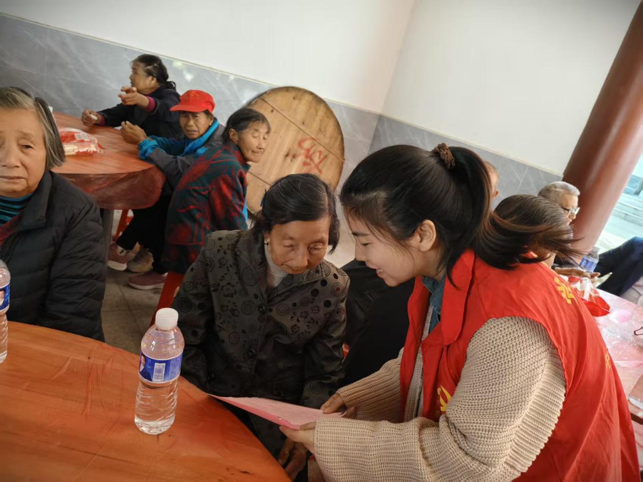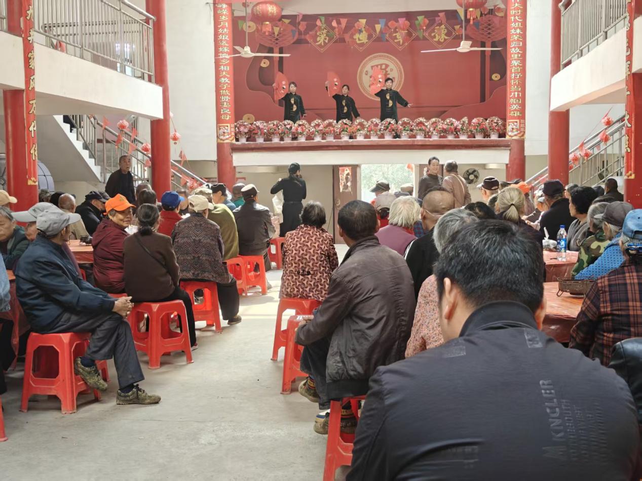 在各村活动现场,文艺汇演精彩纷呈。赤丰村的打鼓表演《今天是个好日子》以激昂的节奏拉开序幕,黄桥村的舞蹈《张灯结彩》用欢快的舞步传递着节日的喜悦,白杨村则用舞蹈《九月九的酒》唤起老人们的时代记忆。除了歌舞表演,各村还同步开展了政策宣传服务。志愿者们耐心细致地为老人们办理养老认证,讲解医保参保政策,解答油菜种植补贴相关问题,并宣传秋冬季森林防火知识。活动现场,老人们或围坐观看演出,或咨询政策问题,或在志愿者的引导下有序用餐,处处洋溢着温馨祥和的气氛。